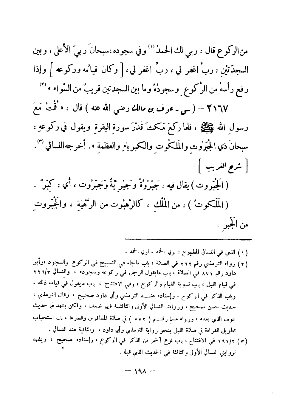2167 - (س) عوف بن مالك - رضي الله عنه -: قال: «قُمْتُ مَعَ رسولِ الله - صلى الله عليه وسلم-، فلما رَكَعَ مَكثَ قَدْرَ سورةِ البقرةِ، ويقول في ركوعهِ: سبحانَ ذي الْجَبَرُوتِ، والمَلَكُوتِ، والكبرياءِ والعظمةِ» . أخرجه النسائي (¬1) .