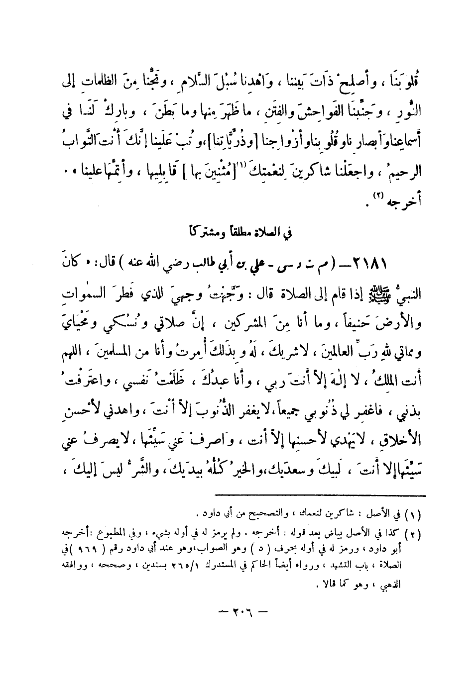 2181 - (م ت د س) علي بن أبي طالب - رضي الله عنه -: قال: «كانَ النبيُّ - صلى الله عليه وسلم- إذا قام إلى الصلاة قال: وَجَّهْتُ وجهيَ للذي فَطرَ السَّمواتِ والأرضَ حَنيفاً، وما أنا مِنَ المشركين، إِنَّ صلاتي ونُسُكي ومَحْيَايَ ومماتي للهِ رَبِّ العالمينَ، لا شريكَ لَهُ، وبِذَلِكَ أُمِرتُ وأنا من المسلمينَ، اللهم أَنت الملِكُ، لا إلهَ إلا أنتَ، أنت ربي، وأنا عبدُكَ، ظَلَمْتُ نَفسي، واعتَرفْتُ بذنبي، فاغفِر لي ذُنُوبي جميعاً، لا يغفر الذُّنُوبَ إِلا أنْتَ، واهدني لأحْسنِ الأخلاقِ لا يَهْدي لأحسنِها إلا أنت، وَاصرفْ عَني سَيِّئَها، لا يصرفُ عني سَيِّئَهَا إِلا أنتَ، لَبيكَ وسعدَيك، والخيرُ كُلُّهُ بيدَيكَ، والشَّرُّ لَيسَ إليكَ، -[207]- أنَا بِكَ وإِليكَ، تَبَارَكتَ وتَعَالَيْتَ، أَستغفِرُكَ وأتوب إليك، وإذا رَكَعَ قال: اللَّهمَّ لَكَ رَكعتُ، وبكَ آمَنتُ، ولك أَسلمتُ، خَشَعَ لك سَمعي، وبَصَري ومُخِّي، وعَظْمي، وعَصَبي، وإِذَا رَفَعَ رَأْسَهُ قال: اللهم رَبَّنا لك الحمدُ مِلءَ السموَاتِ، [ومِلء] الأرضِ، ومِلءَ ما بينهما، وَمِلءَ ما شِئْتَ مِن شَيءٍ بعدُ، وإذا سَجَدَ قال: اللهم لك سَجَدْتُ، وبِكَ آمنت، ولك أَسلمتُ، سَجَدَ وجهي لِلذي خَلَقَهُ وصَوَّرَهُ، وَشَقَّ سَمْعَهُ وَبَصرَهُ، تباركَ الله أحسنُ الخالقينَ، ثم يكونُ مِنْ آخر ما يقُول بَينَ التَّشَهُّدِ والتَّسليم: اللَّهمَّ اغفِر لي مَا قَدَّمتُ، وَمَا أَخَّرتُ، وَمَا أسررْتُ، وما أعلنتُ، وما أسْرَفتُ، وما أَنت أعلم بِهِ مني، أنتَ المُقَدِّمُ، وأنت المؤخِّرُ، لا إله إلا أنتَ» هذه رواية مسلم، والترمذي.