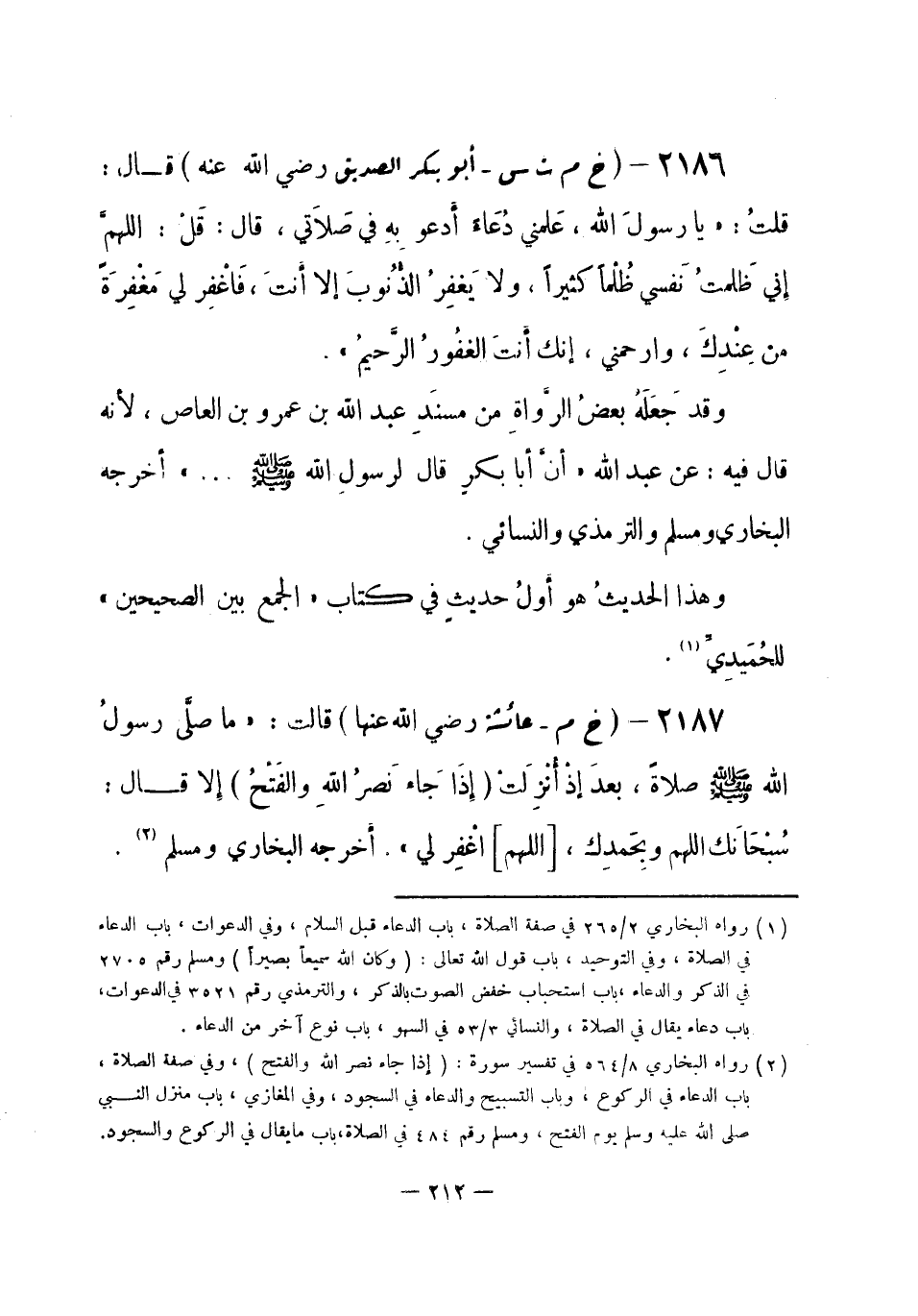 2186 - (خ م ت س) أبو بكر الصديق - رضي الله عنه -: قال: قُلْتُ: «يا رسولَ الله، عَلمني دُعاء أَدعو بِهِ في صَلاتي، قال: قُلْ: اللهمَّ إني ظَلمتُ نَفسي ظُلْماً كثيراً، ولا يَغفِرُ الذُّنُوبَ إِلا أَنتَ، فَاغْفِر لي مَغْفِرَة من عِنْدِكَ، وارحمني، إنك أَنتَ الغَفُورُ الرَّحيمُ» .