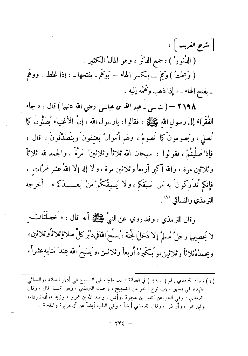 2198 - (ت س) عبد الله بن عباس - رضي الله عنهما -: قال: «جاء الفُقَرَاءُ إلى رسولِ الله -صلى الله عليه وسلم-، فقالوا: يا رسول الله، إنَّ الأغنياءَ يُصَلُّونَ كما نُصلي، ويصومونَ كما نَصوم، ولهم أمْوالٌ يَعتِقونَ ويَتَصَدَّقُونَ، قال: فإذا صَلَّيتُمْ، فقولوا: سبحانَ الله ثلاثاً وثلاثينَ مَرَّة، والحمد لله ثلاثاً وثلاثين مرة، والله أكبر أربعاً وثلاثين مرة، ولا إله إلا اللهُ عشر مَرَّاتٍ، فإنكم تُدْرِكونَ به مَن سَبَقَكم، ولا يَسبِقُكُمْ مَنْ بَعدَكم» . أخرجه الترمذي، والنسائي (¬1) .