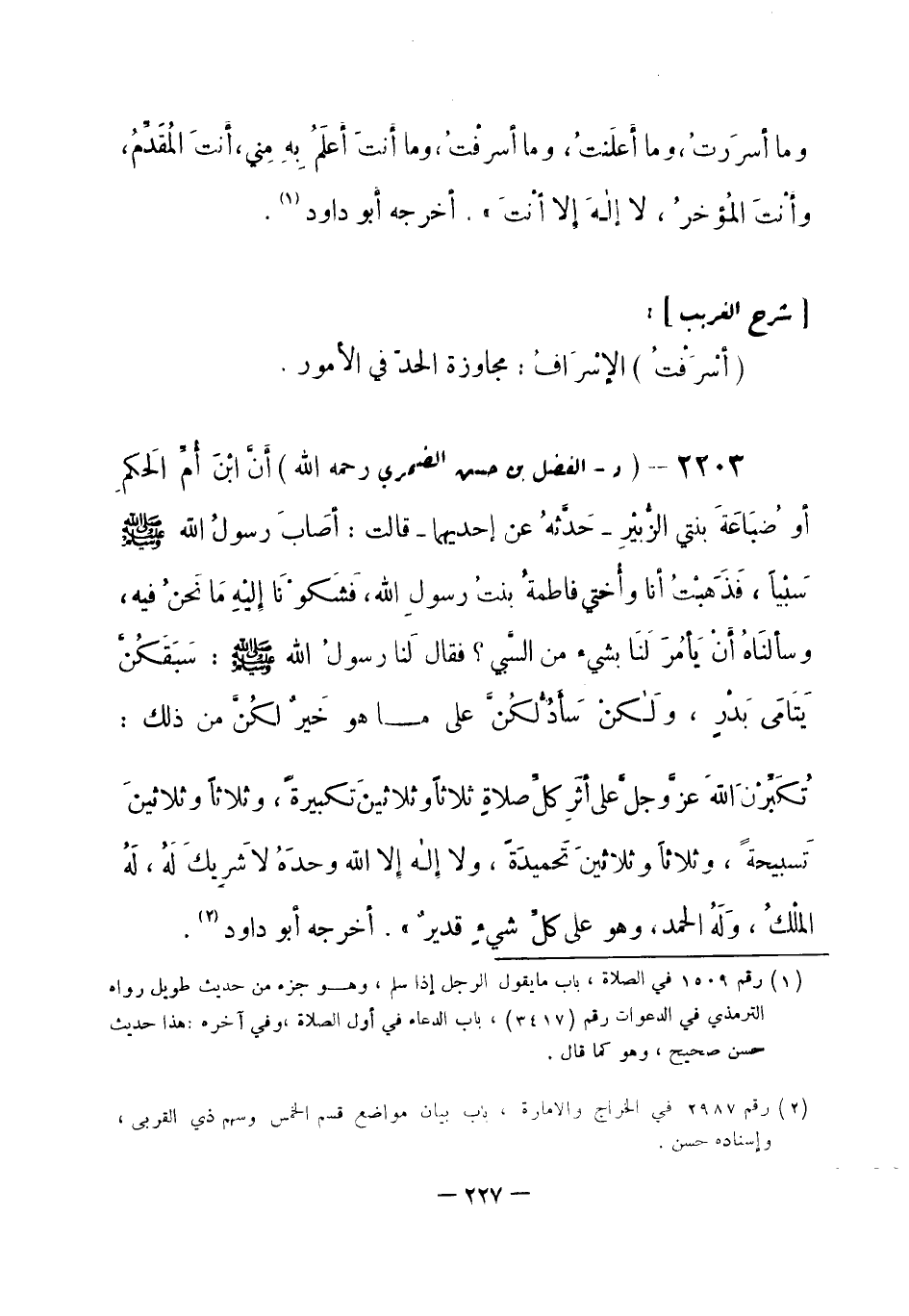 2203 - (د) الفضل بن حسن الضمري - رحمه الله - أَنَّ ابْنَ أُمِّ الحَكمِ أو ضُبَاعَةَ بنتي الزُّبَيْرِ - حَدَّثهُ عن إحديهما - قالت: أصَابَ رسولُ الله - صلى الله عليه وسلم- سَبْياً، فَذَهَبْتُ أنا وأُختي فاطمةُ بنتُ رسولِ الله، فَشَكوْنَا إليْهِ مَا نَحنُ فيه، وسألنَاهُ أَنْ يَأمُرَ لَنَا بشيء من السَّبي؟ فقال لَنا رسولُ الله - صلى الله عليه وسلم-: «سَبَقَكُنَّ يَتَامَى بَدْرٍ، وَلَكنْ سَأَدُلُّكُنَّ على ما هو خَيرٌ لكُنَّ من ذلك: تُكَبِّرْنَ اللهَ عزَّ وجلَّ على أثَرِ كلِّ صلاةٍ ثلاثاً وثلاثينَ تَكبيرة، وثلاثاً وثلاثينَ تَسبيحة، وثلاثاً وثلاثينَ تَحميدَة، ولا إله إلا الله وحدَهُ لا شَرِيكَ لَهُ، لَهُ المُلْكُ، وَلَهُ الحمد، وهو على كلِّ شيءٍ قَديرٌ» . أخرجه أبو داود (¬1) .