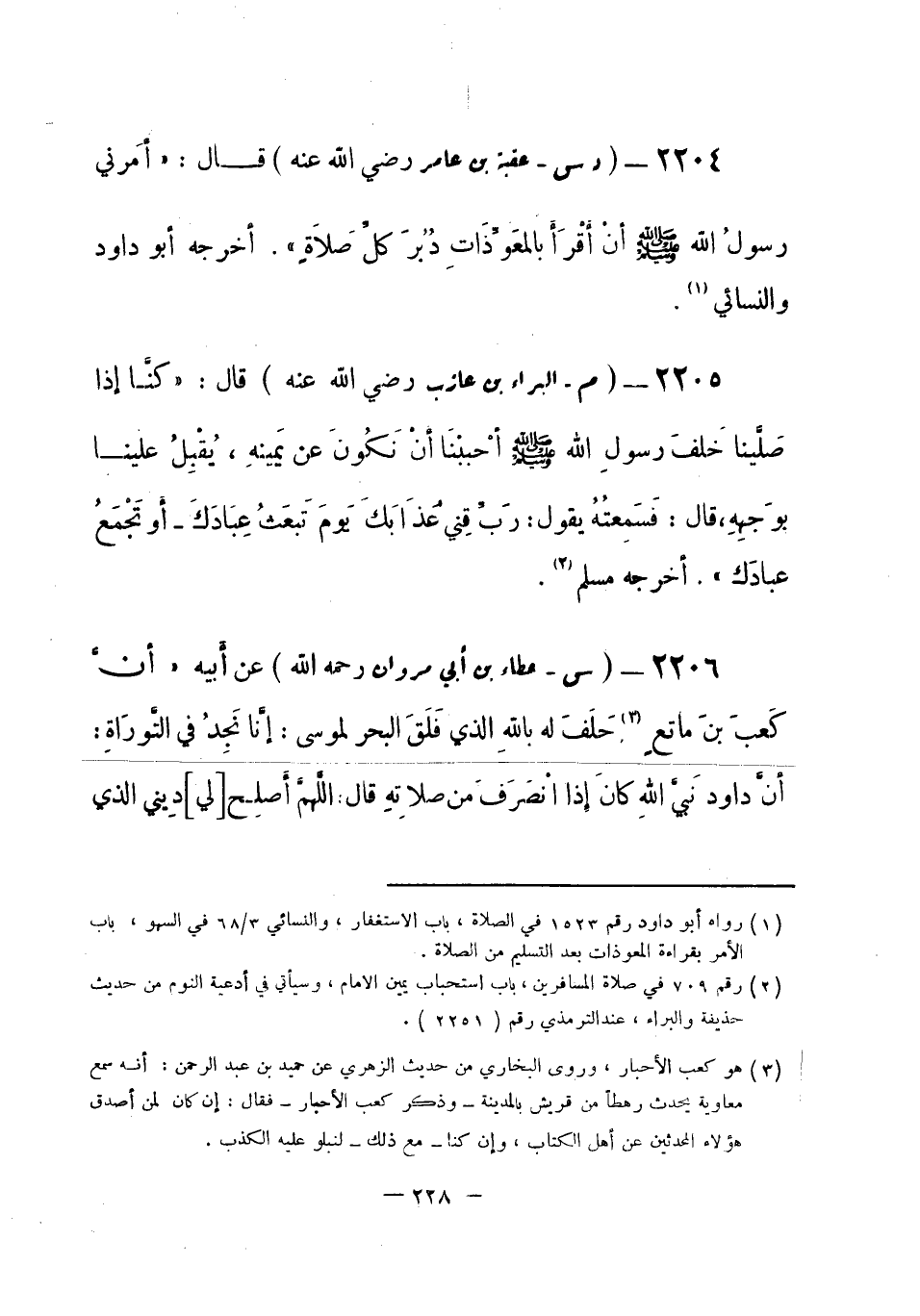 2204 - (د س) عقبة بن عامر - رضي الله عنه -: قال: «أَمَرني رسولُ الله - صلى الله عليه وسلم- أنْ أَقْرَأَ بالمعَوِّذَاتِ دُبُرَ كلِّ صَلاةٍ» . أخرجه أبو داود، والنسائي (¬1) .