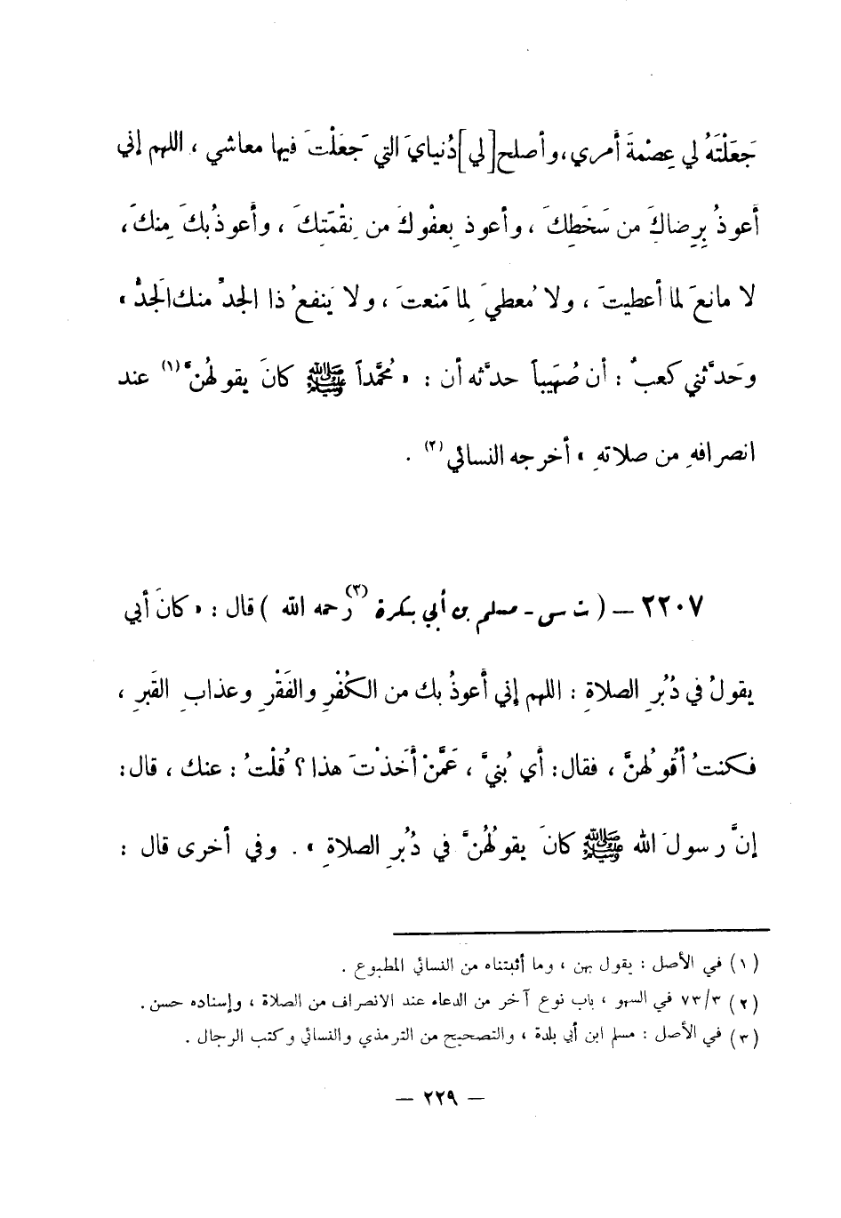 2207 - (ت س) مسلم بن أبي بكرة (¬1) - رحمه الله -: قال: «كانَ أبي يقولُ في دُبُرِ الصلاةِ: اللهم إني أَعوذُ بك من الكُفْرِ والفَقْرِ وعذابِ القَبرِ، فكنتُ أقُولُهنَّ، فقال: أي بُنيَّ، عَمَّنْ أَخَذْتَ هذا؟ قُلْتُ: عنك، قال: إنَّ رسولَ الله - صلى الله عليه وسلم- كانَ يقولُهُنَّ في دُبُرِ الصلاةِ» .