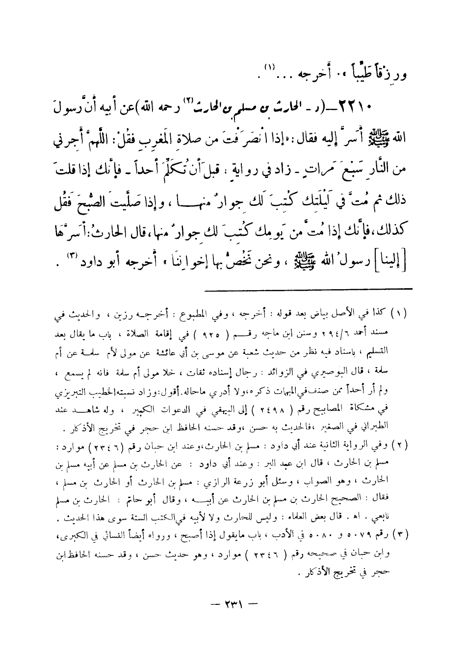 2210 - (د) الحارث بن مسلم بن الحارث (¬1) - رحمه الله -: عن أبيه أَنَّ رسولَ الله - صلى الله عليه وسلم- أسَرَّ إليه فقال: «إذا انْصَرَفْتَ من صلاةِ المَغرِبِ فقُلْ: اللَّهمَّ أَجِرني من النَّارِ سَبْعَ مَراتٍ - زاد في روايةٍ: قبلَ أن تُكَلِّمَ أحداً - فَإنَّك إذا قلتَ ذلك ثم مُتَّ في لَيْلَتِكَ كُتِبَ لَك جِوارٌ منها، وإذا صَلَّيتَ الصُّبحَ فَقُل كذلك، فإنَّك إذا مُتَّ من يَومِك كُتِبَ لك جِوارٌ منها، قال الحارثُ: أَسَرَّهَا [إلينا] رسولُ الله - صلى الله عليه وسلم-، ونحن نَخُصُّ بها إخوانَنَا» . أخرجه أبو داود (¬2) .