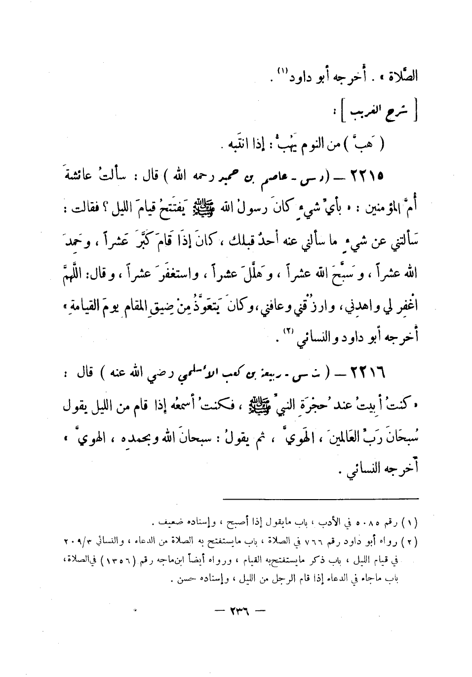 2216 - (ت س) ربيعة بن كعب الأسلمي - رضي الله عنه -: قال: «كنتُ أبِيتُ عند حُجْرَةِ النبيِّ -صلى الله عليه وسلم-، فكنتُ أسمعُه إذا قام من الليل يقول: سُبحَانَ رَبِّ العَالمينَ، الهَويَّ، ثم يقولُ: سبحانَ الله وبحمدِهِ، الهويَّ» أخرجه النسائي. -[237]-