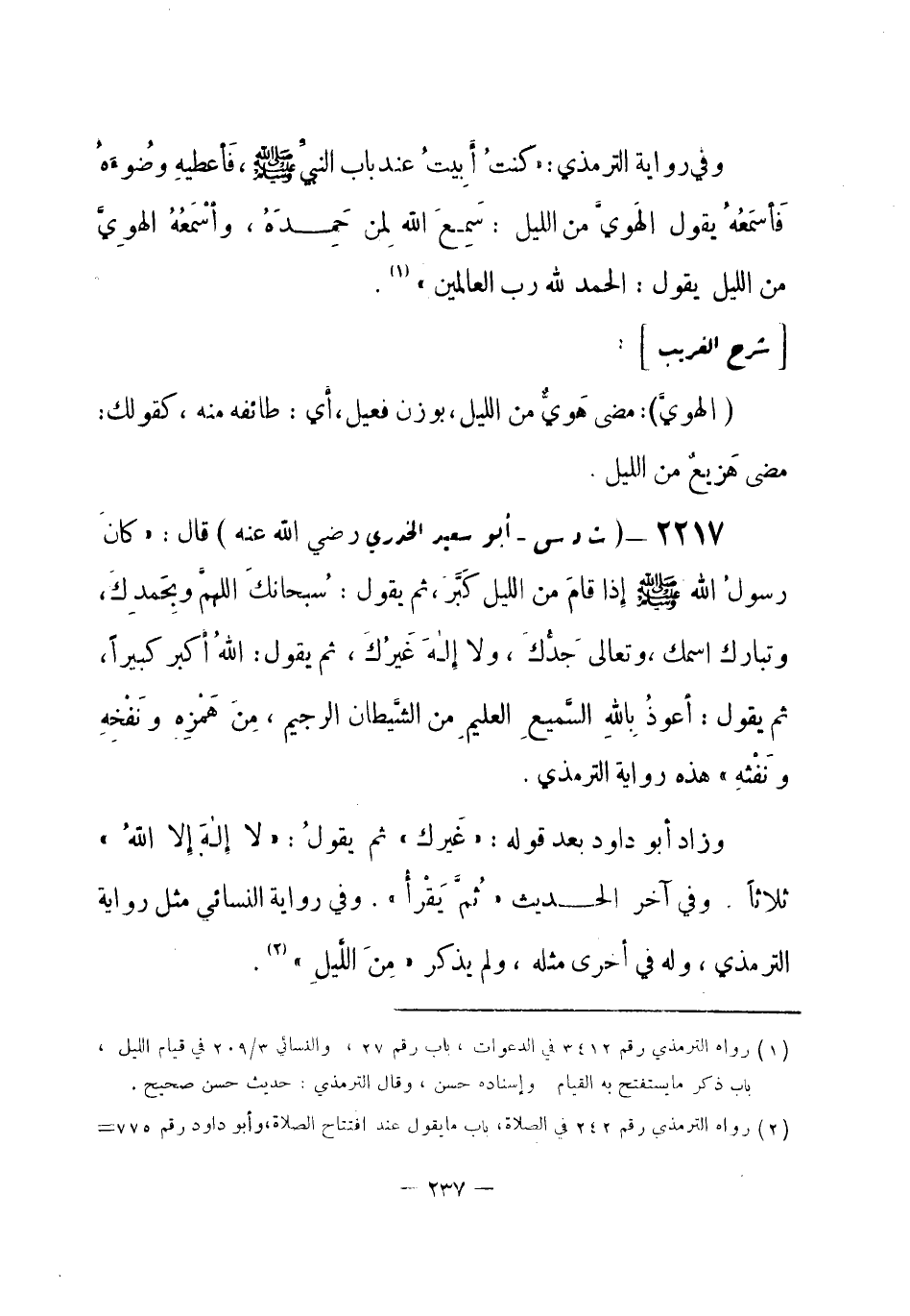 2217 - (ت د س) أبو سعيد الخدري - رضي الله عنه -: قال: «كانَ رسولُ الله - صلى الله عليه وسلم- إذا قامَ من الليل كَبَّرَ، ثم يقول: سُبحانَك اللهمَّ وبِحَمدِكَ، وتبارك اسمك، وتعالى جَدُّكَ، ولا إِلَهَ غَيرُكَ، ثم يقول: اللهُ أكبر كبيراً، ثم يقول: أعوذُ بِاللهِ السَّميعِ العليمِ من الشَّيطان الرجيم، مِنَ هَمْزِهِ ونَفْخِهِ ونَفْثِهِ» . هذه رواية الترمذي.