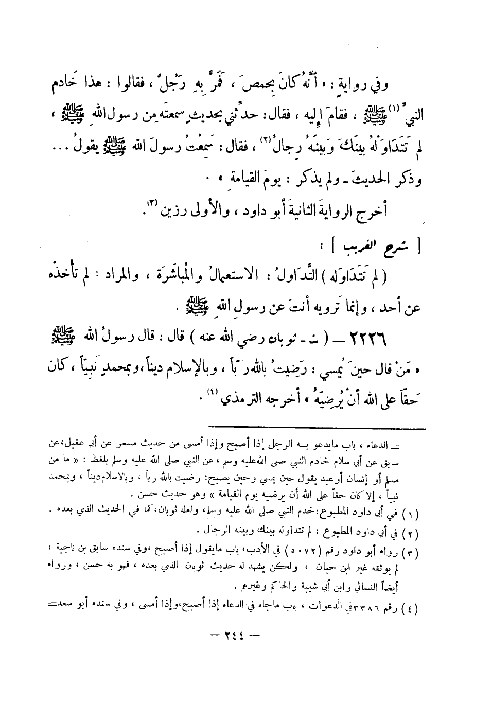 2226 - (ت) ثوبان - رضي الله عنه -: قال: قال رسولُ الله - صلى الله عليه وسلم-: «مَنْ قال حينَ يُمسي: رَضِيتُ بالله ربّاً، وبالإسلامِ ديناً، وبمحمدٍ نَبِيّاً، كان حَقّاً على الله أنْ يُرضِيَهُ» أخرجه الترمذي (¬1) .