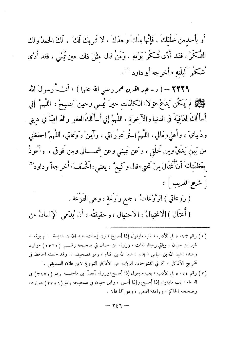 2229 - (د) عبد الله بن عمر - رضي الله عنهما -: «أَنَّ رسولَ الله -صلى الله عليه وسلم- لم يَكُن يَدَعُ هؤلاءِ الكلِمَاتِ حينَ يُمسي وحينَ يُصبِحُ: اللَّهمَّ إني أسألُكَ العَافِيَةَ في الدنيا والآخِرةِ، اللَّهمَّ إني أَسألُكَ العَفو والعَافِيَةَ في دِيني ودُنيايَ، وأهلي ومَالي، اللَّهمَّ استُر عَوْرَاتي، وآمِنْ رَوْعَاتي، اللَّهمَّ احفظني من بَينِ يَدَيَّ ومِن خَلْفي، وَعن يَميني، وعن شِمالي، ومِن فَوقي، وأعُوذُ بِعَظَمَتِكَ أنْ أُغْتَالَ مِنْ تَحتي» قال وكيعٌ: يعني الخَسْفَ. أخرجه أبو داود (¬1) .