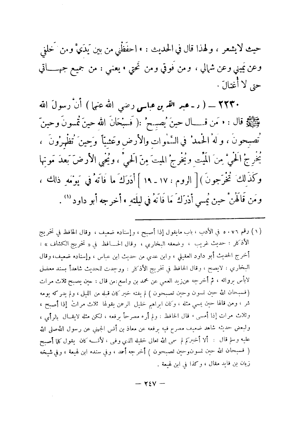 2230 - (د) عبد الله بن عباس - رضي الله عنهما -: أنَّ رسولَ الله - صلى الله عليه وسلم- قال: «مَن قال حينَ يُصبِحُ: {فَسُبْحَانَ اللهِ حينَ تُمسونَ وحينَ تُصبِحونَ. ولَهُ الْحمدُ في السَّماواتِ والأرضِ وَعَشِيّاً وَحِينَ تُظْهِرُونَ. يُخْرِجُ الحَيَّ مِنَ المَيِّتِ ويُخْرجُ الميتَ مِنَ الحَيِّ ويُحْيي الأرضَ بَعدَ مَوتِها وكَذَلِكَ تُخْرَجونَ} [الروم: 17 - 19] ، أدرَكَ مَا فَاتَهُ في يَوْمِه ذلك، ومَن قَالَهُنَّ حين يُمسي أدْرَكَ مَا فَاتَهُ في لَيلَتِه» أخرجه أبو داود (¬1) .