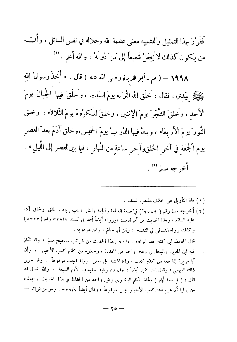 قال الحافظ ابن كثير بعد إيراده 1 / 69: وهذا الحديث من غرائب صحيح مسلم، وقد تكلم فيه ابن المديني والبخاري وغير واحد من الحفاظ، وجعلوه من كلام كعب الأحبار، وأن أبا هريرة إنما سمعه من كلام كعب، وإنما اشتبه على بعض الرواة فجعله مرفوعاً، وقد حرر ذلك البيهقي، وقال ابن كثير أيضاً 3 / 488: وفيه استيعاب الأيام السبعة، والله تعالى قد قال: {في ستة أيام} ، ولهذا تكلم البخاري وغير واحد من الحفاظ في هذا الحديث وجعلوه من رواية أبي هريرة عن كعب الأحبار ليس مرفوعاً، وقال أيضاً 7 / 326: وهو من غرائب -[26]- الصحيح، وقد علله البخاري في " التاريخ " فقال: رواه بعضهم عن أبي هريرة رضي الله عنه، عن كعب الأحبار، وهو الأصح، وقال المناوي في " فيض القدير ": وقال بعضهم: هذا الحديث في متنه غرابة شديدة، فمن ذلك أنه ليس فيه ذكر خلق السموات، وفيه ذكر خلق الأرض وما فيها في سبعة أيام، وهذا خلاف القرآن، لأن الأربعة خلقت في أربعة أيام، ثم خلقت السموات في يومين، وقد سكت عن الحديث النووي في " شرح مسلم "، وممن صحح الحديث، الشوكاني في " فتح القدير " وقد تكلم عليه العلماء من جهة متنه، ورأوا أنه معارض للقرآن، ومن صححه كالشوكاني وغيره، رأوا أنه لا تعارض بينه وبين نص القرآن، فإن القرآن ذكر أن الله تعالى خلق السموات والأرض جميعاً في ستة أيام، وخلق الأرض وحدها في يومين، والحديث إنما بين أن الله تعالى خلق ما في الأرض في سبعة أيام، ويحتمل عند بعض من صححه أن تكون هذه الأيام السبعة غير الأيام الستة التي ذكرها الله تعالى في خلق السموات والأرض، وحينئذ لا تكون معارضة، وإنما الحديث فصل كيفية الخلق على الأرض وحدها، والله تعالى أعلم.