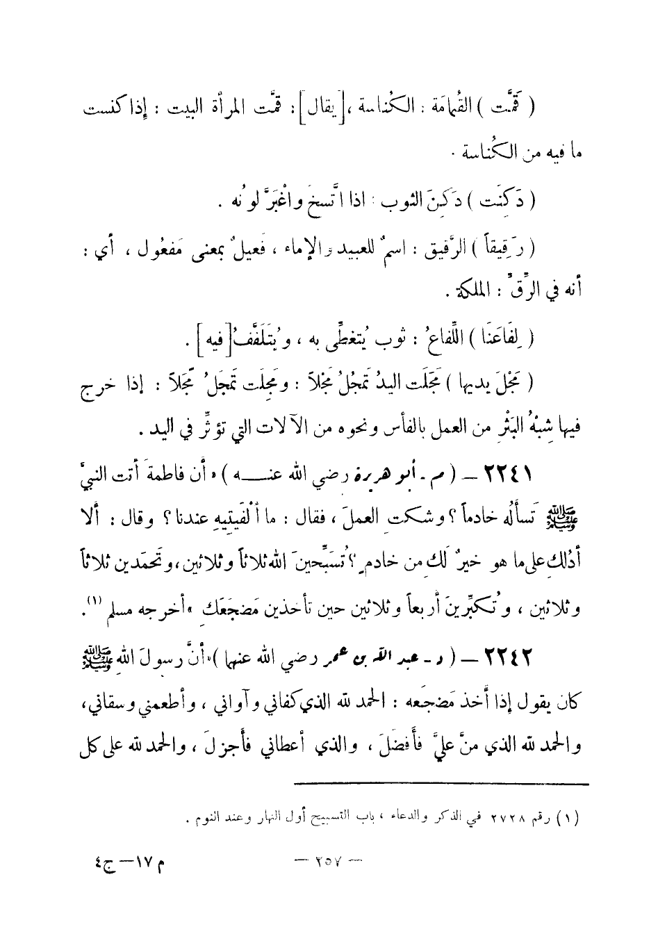 2241 - (م) أبو هريرة - رضي الله عنه -: «أنَّ فاطمةَ أتت النبيَّ - صلى الله عليه وسلم- تَسأَلُه خادماً؟ وشكتِ العملَ، فقال: ما أَلْفَيتِيِهِ عندنا؟ وقال: ألا أدُلكِ على ما هو خَيرٌ لَكِ من خادمٍ؟ تُسَبِّحينَ الله ثلاثاً وثلاثين، وتَحمَدين ثلاثاً وثلاثين، وتُكبِّرينَ أربعاً وثلاثين حين تأخذين مَضجَعَكِ» أخرجه مسلم (¬1) .