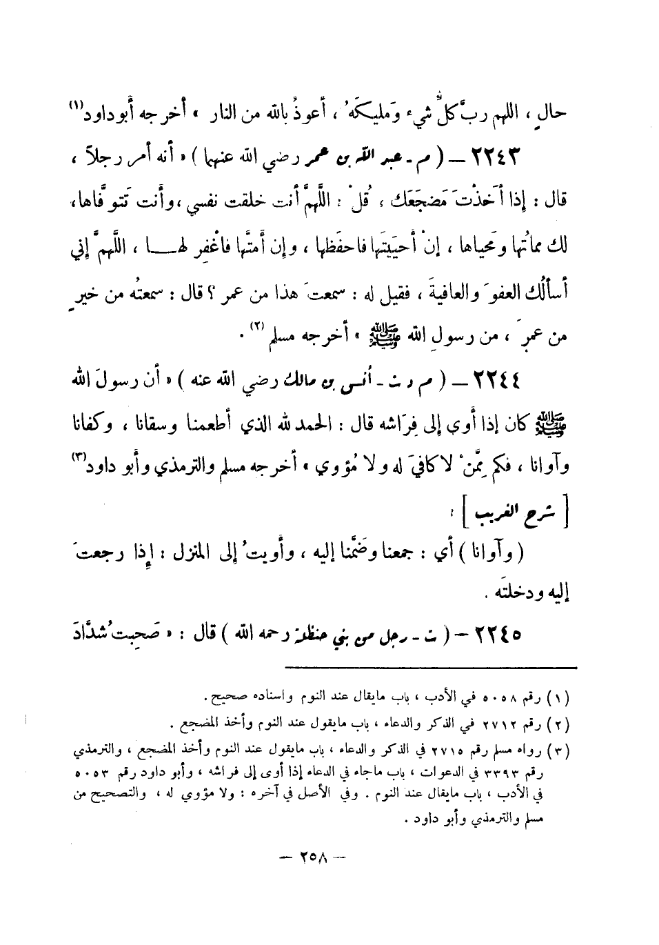 2244 - (م د ت) أنس بن مالك - رضي الله عنه -: «أنَّ رسولَ الله -صلى الله عليه وسلم- كان إذا أوى إلى فِرَاشِهِ قال: الحمد لله الذي أطعمنا وسقانا، وكفانا، وآوانا، فكم مِمَّنْ لا كافيَ له ولا مُؤوي» أخرجه مسلم، والترمذي، وأبو داود (¬1) .