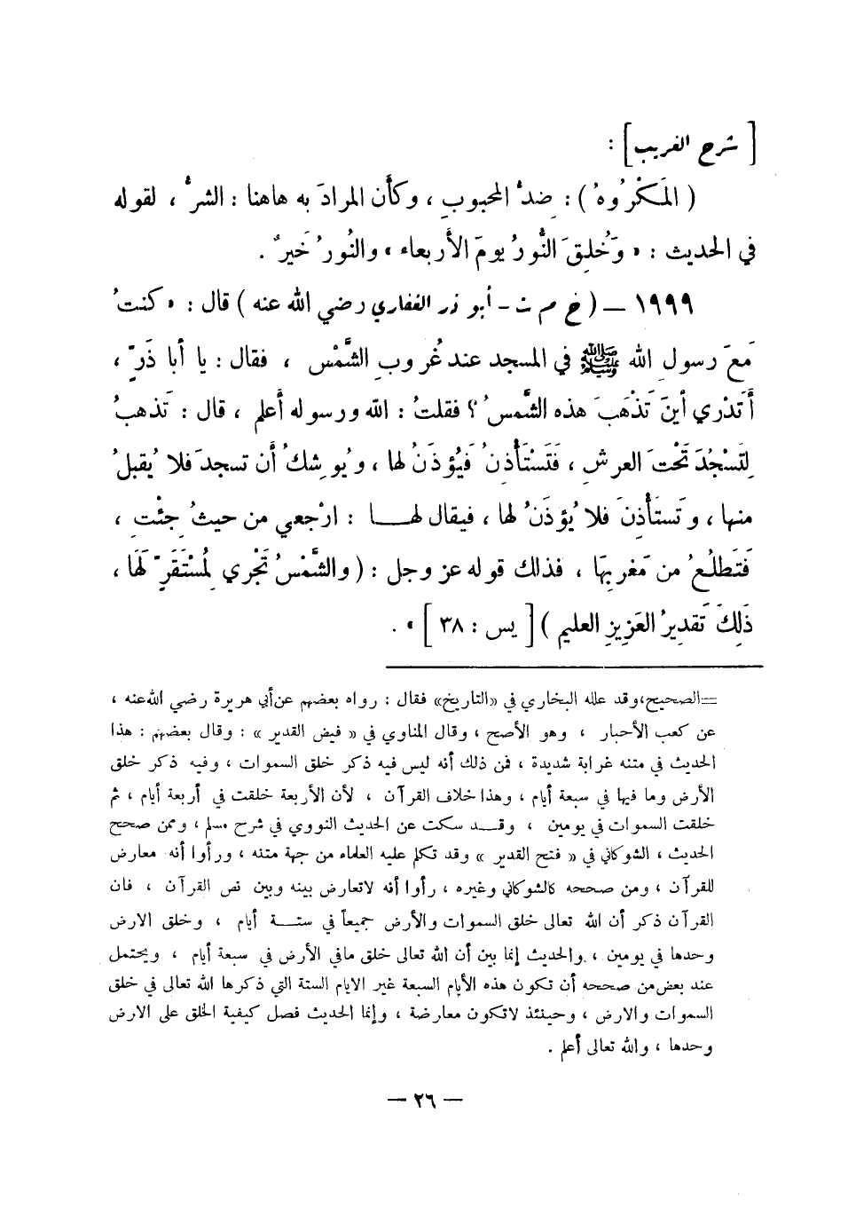 (¬1) البخاري 8 / 416 في تفسير سورة يس، باب قوله تعالى: {والشمس تجري لمستقر لها} ، وفي بدء الخلق، باب صفة الشمس والقمر، وفي التوحيد، باب وكان عرشه على الماء، وباب قول الله تعالى: {تعرج الملائكة والروح إليه} ، ومسلم رقم (159) في الإيمان، باب بيان الزمن الذي لا يقبل فيه الإيمان، والترمذي رقم (4225) في التفسير، باب ومن سورة يس، وقد أورده السيوطي في " الدر المنثور " 5 / 263 وزاد نسبته لعبد بن حميد، وابن أبي حاتم، وأبي الشيخ في " العظمة " وابن مردويه، والبيهقي في " الأسماء والصفات "، وانظر التعليق على الحديث رقم (780) جزء 2 / صفحة 332 من هذا الكتاب، و " زاد المسير في علم التفسير " لابن الجوزي 7 / 18 و 19 طبع المكتب الإسلامي، حول هذا الحديث وكلام العلماء عليه.