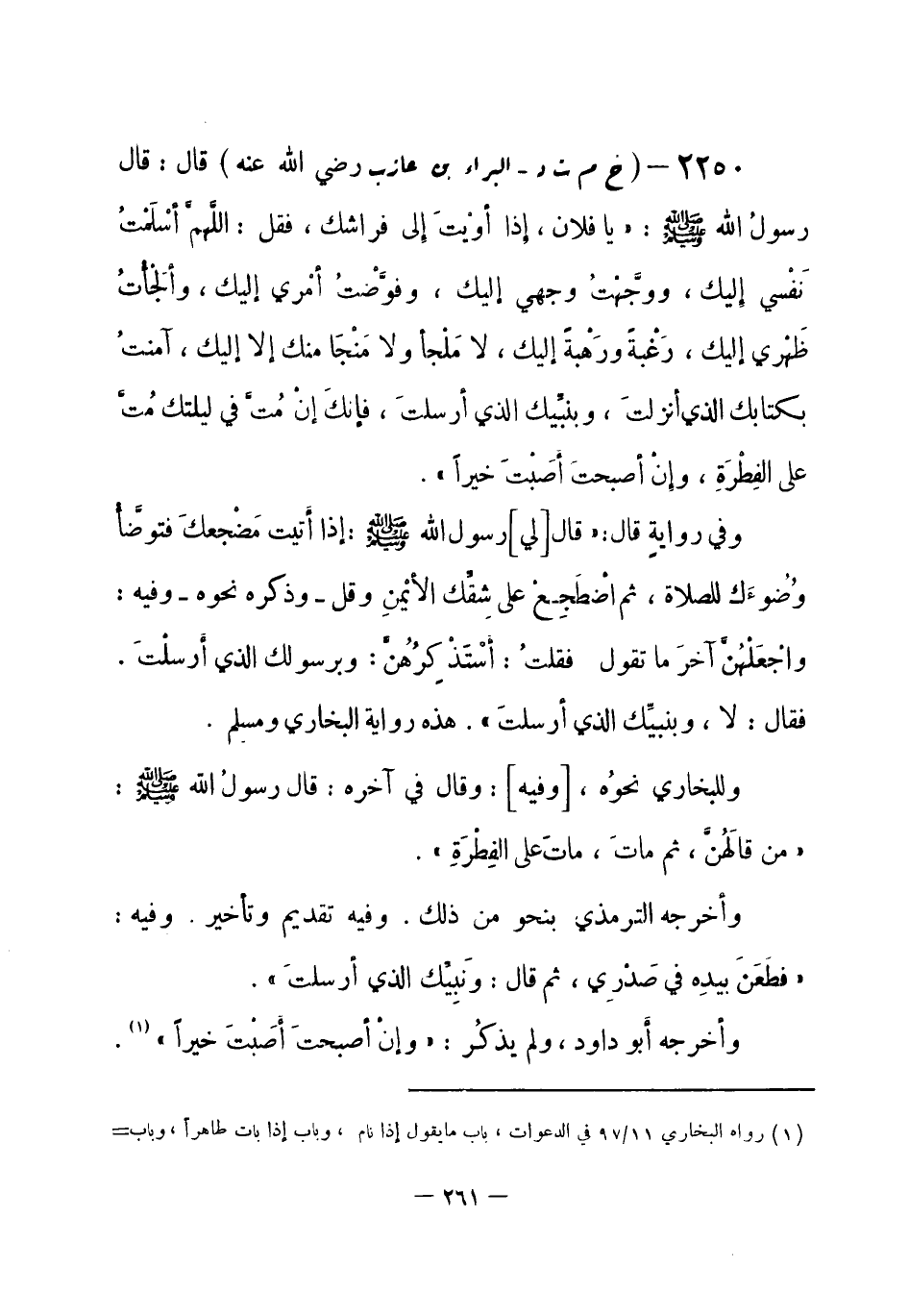 2250 - (خ م ت د) البراء بن عازب - رضي الله عنه -: قال: قال رسولُ الله - صلى الله عليه وسلم-: «يا فلان، إذا أوْيتَ إلى فراشك، فقل: اللَّهمَّ أسْلَمْتُ نَفْسي إليك، ووجَّهْتُ وجهي إليك، وفوَّضْتُ أمْري إليك، وألجَأْتُ ظَهْري إليك، رَغْبة ورَهْبة إليك، لا مَلْجأ، ولا مَنْجَا منك إلا إليك، آمنتُ بكتابك الذي أنزلتَ، وبنبيِّك الذي أرسلتَ، فإنكَ إنْ مُتَّ في ليلتك مُتَّ على الفِطْرَةِ، وإنْ أصبحتَ أَصَبْتَ خيراً» .