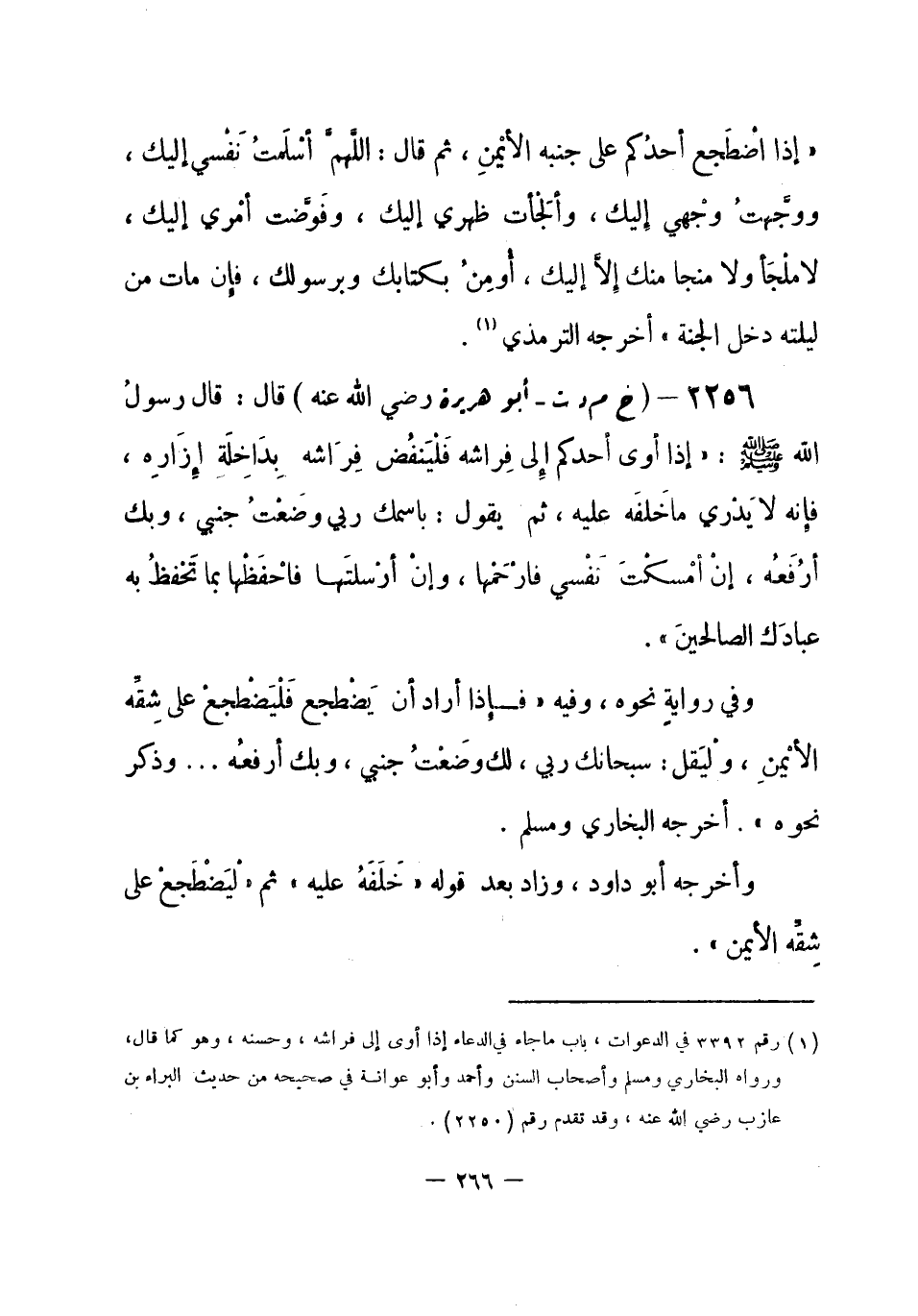 2256 - (خ م د ت) أبو هريرة - رضي الله عنه -: قال: قال رسولُ الله -صلى الله عليه وسلم-: «إذا أوى أحدكم إِلى فِراشه فَلْيَنفُض فِرَاشه بِدَاخِلَةِ إِزَارِهِ، فَإِنه لا يَدْري ما خَلفَه عليه، ثم يقول: باسمك ربي وَضَعْتُ جنبي، وبك أرفعُهُ، إنْ أَمْسكْتَ نَفْسي فارْحَمْها، وإنْ أرْسَلتَها فَاحْفَظْها بما تَحْفظُ به عبادَك الصالحينَ» .