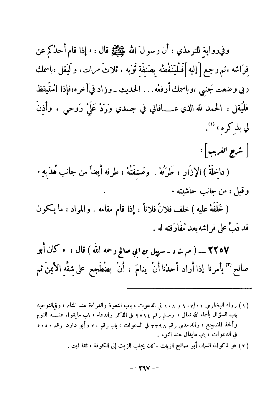2257 - (م ت د) سهيل بن صالح - رحمه الله -: قال: كان أَبو صالح (¬1) يأمرنا إذا أراد أحدُنا أَنْ ينامَ: أنْ يضْطَجع على شِقِّهِ الأيمنَ ثم -[268]- يقول: «اللَّهمَّ ربَّ السماواتِ وربَّ الأرضِ، وربَّ العرْشِ العظيم، وربَّ كُلِّ شيء، فالِقَ الحَبِّ والنَّوَى، مُنْزِلَ التَّوراةِ، والإِنْجِيل، والقرآن، أَعُوذ بك من شرِّ كُلِّ دَابَّةٍ أنتَ آخِذٌ بِناصيتها، اللهم أَنت الأولُ فليس قبلك شيء، وأنت الآخِرُ فليس بَعدَك شيء، وأنت الظَّاهِرُ فليس فوْقَك شيء، وأنت الباطِنُ فليس دُونَك شيء» ، «اقْضِ عنا الديْنَ وأغْنِنا من الفقرِ» .
