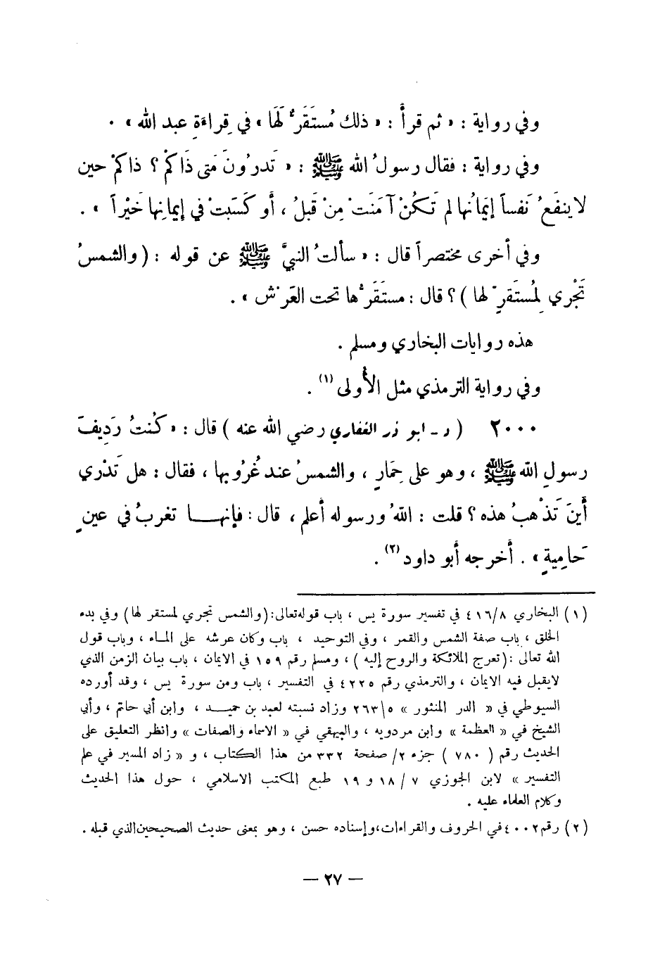 2000 - (د) أبو ذر الغفاري - رضي الله عنه -: قال: كُنتُ رَدِيفَ رسولِ اللهِ - صلى الله عليه وسلم- وهو على حِمَارٍ، والشمسُ عند غُرُوبها، فقال: «هَل تَدْري أَينَ تَذْهبُ هذه؟» قلت: اللهُ ورسوله أعلم، قال: «فإنها تغربُ في عينٍ حَامِيةٍ» . أخرجه أبو داود (¬1) . -[28]-