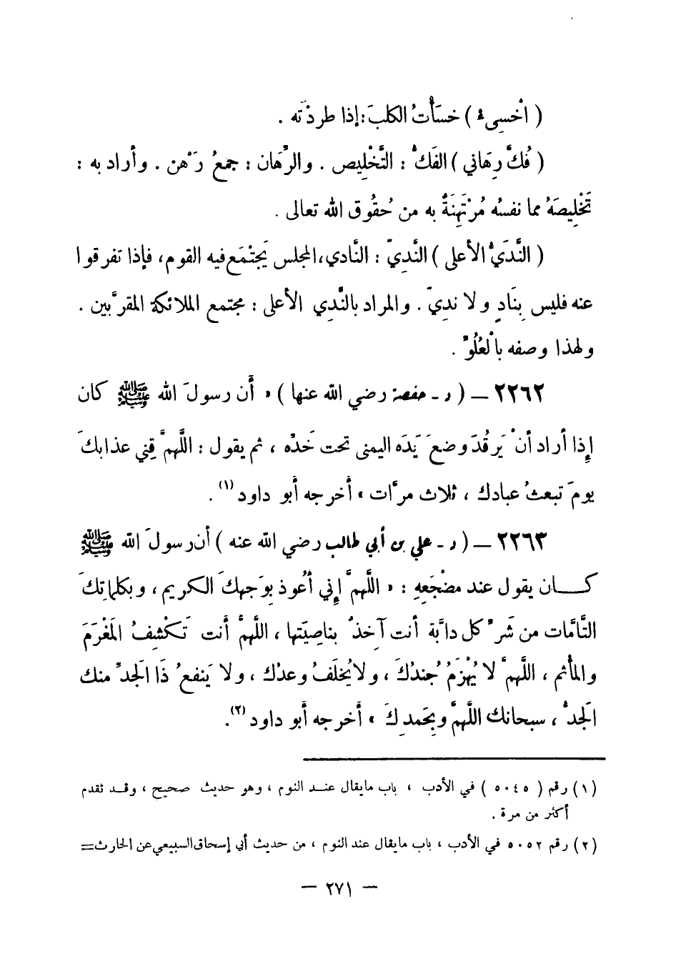2263 - (د) علي بن أبي طالب - رضي الله عنه -: أن رسولَ الله - صلى الله عليه وسلم- كان يقول عند مضْجَعِهِ: «اللَّهمَّ إِني أَعُوذ بِوَجهكَ الكريم، وبِكلماتِكَ التَّامَّات من شَرِّ كل دابَّة أنت آخِذٌ بناصِيَتها، اللَّهمَّ أنت تَكْشِفُ المَغْرَمَ والمأْثم، اللَّهم لا يُهْزَمُ جُندُكَ، ولا يُخْلَفُ وعدُك، ولا يَنفعُ ذَا الجَدِّ منك الجَدُّ، سبحانك اللَّهمَّ وبِحَمدِكَ» أخرجه أبو داود (¬1) .