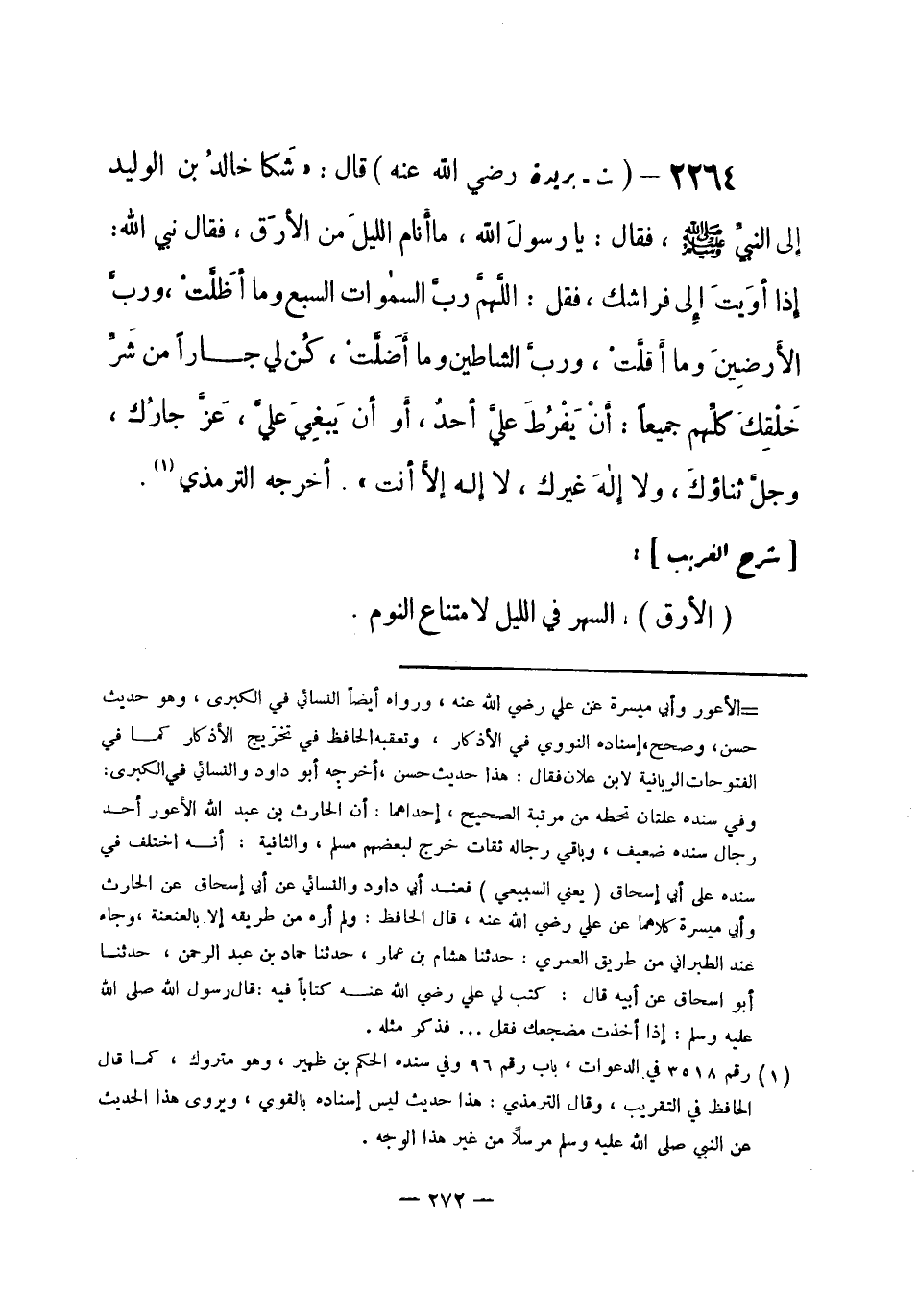 2264 - (ت) بريدة - رضي الله عنه -: قال: «شَكا خالدُ بن الوليد إلى النبيِّ - صلى الله عليه وسلم-، فقال: يا رسولَ الله، ما أَنام الليلَ من الأرَق، فقال نبي الله: إذا أوَيتَ إِلى فراشك، فقل: اللَّهمَّ ربَّ السموات السبع وما أَظَلَّت، وربَّ الأرضِينَ وما أَقَلَّتْ، وربَّ الشياطين وما أَضَلَّتْ، كُن لي جاراً من شَرِّ خَلْقِك كلِّهم جميعاً: أنْ يَفْرُطَ عليَّ أحدٌ، أو أن يَبغِيَ عليَّ، عَزَّ جَارُك، وجلَّ ثناؤكَ، ولا إلهَ غيرك، لا إله إلا أنت» . أخرجه الترمذي (¬1) .