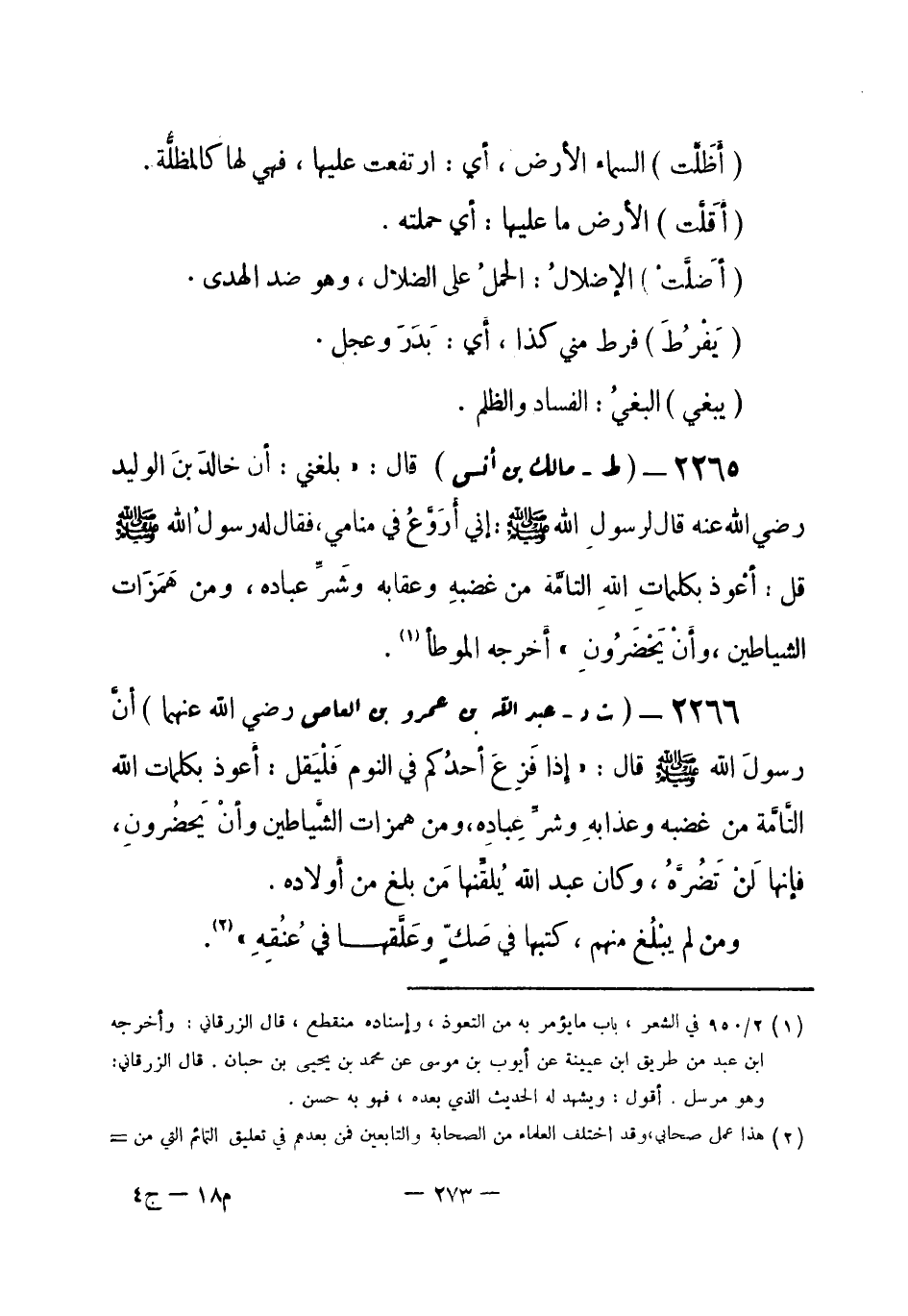 2265 - (ط) مالك بن أنس: قال: «بلغني: أن خالدَ بنَ الوليد - رضي الله عنه - قال لرسولِ الله - صلى الله عليه وسلم-: إني أُرَوَّعُ في منامي، فقال له رسولُ الله - صلى الله عليه وسلم-: قل أعُوذُ بكلماتِ اللهِ التامَّة من غضبهِ وعقابه وشَرِّ عباده، ومن هَمَزَاتِ الشياطين، وأنْ يَحْضرُونِ» أخرجه الموطأ (¬1) .