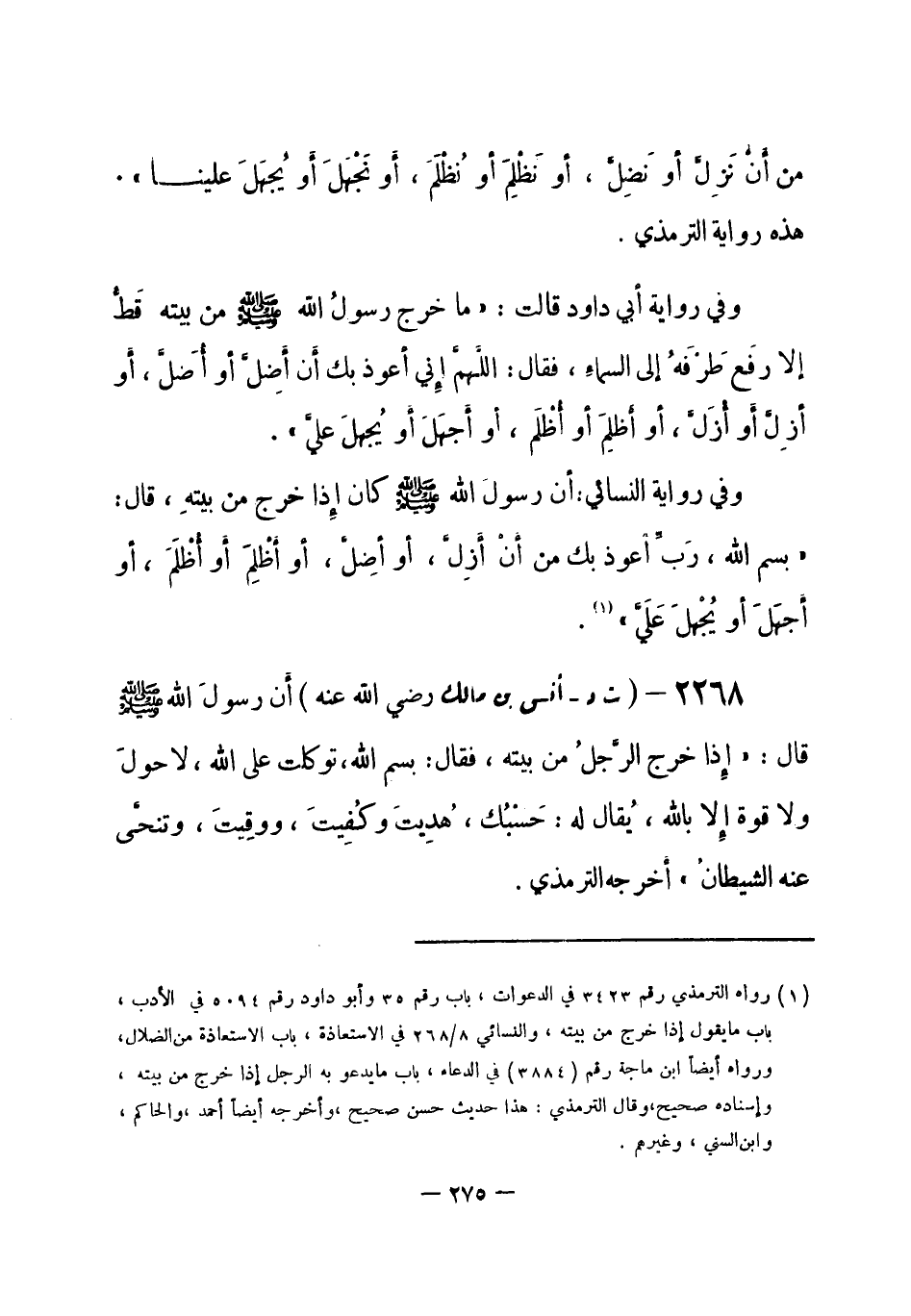 2268 - (ت د) أنس بن مالك - رضي الله عنه -: أنَّ رسولَ الله - صلى الله عليه وسلم- قال: «إِذا خرج الرَّجُلُ من بيته، فقال: بسم الله، توكلت على الله، لا حولَ، ولا قوة إلا بالله، يُقال له: حَسْبُك، هُدِيتَ، وكُفِيتَ، ووقِيتَ، وتنحَّى عنه الشيطانُ» أخرجه الترمذي. -[276]-