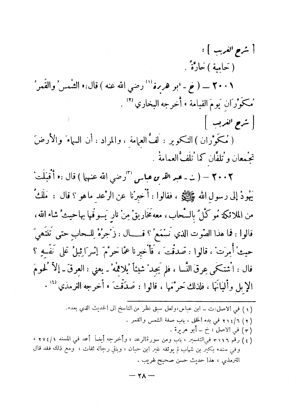 2001 - (خ) أبو هريرة (¬1) - رضي الله عنه -: قال: «الشَّمسُ والقَمرُ مُكَوَّرَانِ يَومَ القيامة» أخرجه البخاري (¬2) .