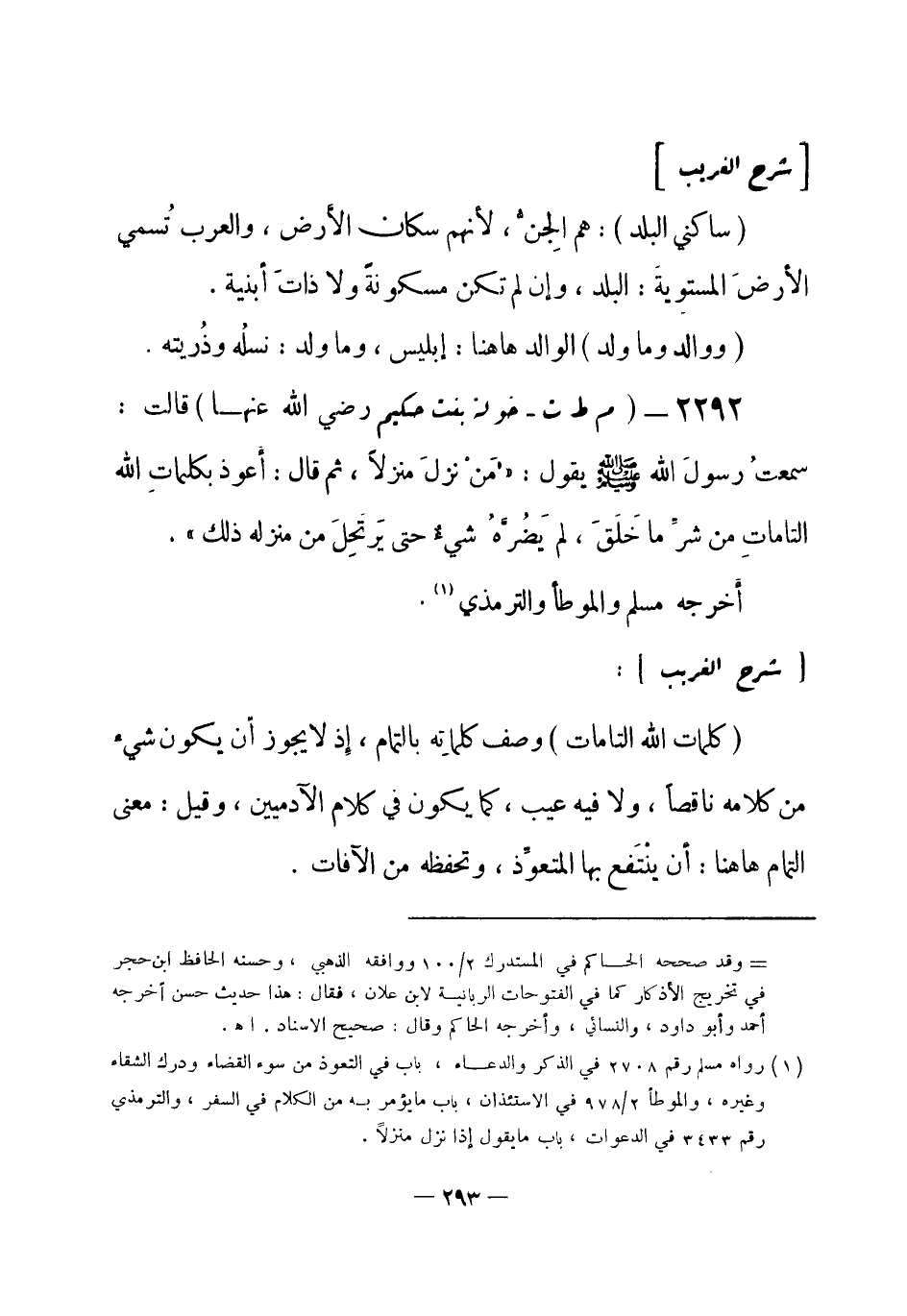 (¬1) رواه مسلم رقم (2708) في الذكر والدعاء، باب في التعوذ من سوء القضاء ودرك الشقاء وغيره، والموطأ 2 / 978 في الاستئذان، باب ما يؤمر به من الكلام في السفر، والترمذي رقم (3433) في الدعوات، باب ما يقول إذا نزل منزلاً.