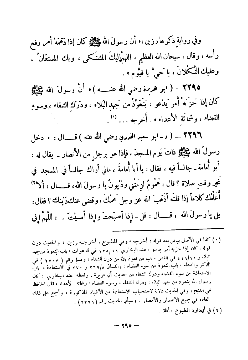 2295 - (خ) أبو هريرة - رضي الله عنه -: «أنَّ رسولَ الله - صلى الله عليه وسلم- كان إذا حَزَبَهُ أمر يَدْعو: يَتَعَوَّذُ من جَهدِ البَلاء، ودَرْكِ الشقاء، وسوء القضاء، وشماتَةِ الأعداء» أخرجه ... (¬1) .