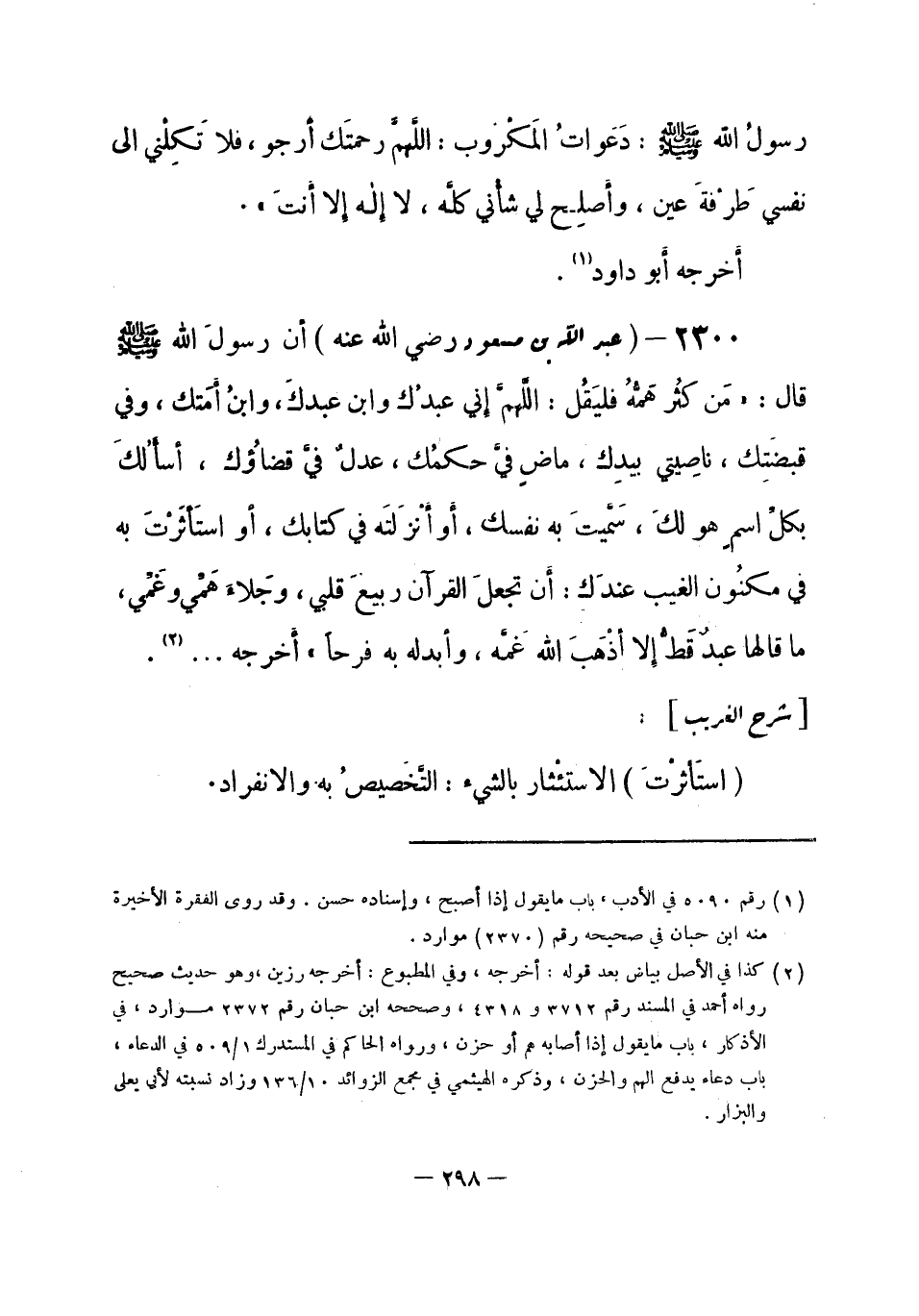 2300 - () عبد الله بن مسعود - رضي الله عنه -: أن رسولَ الله - صلى الله عليه وسلم- قال: «مَن كَثُر هَمُّهُ فَليَقُل: اللَّهمَّ إِني عَبدُك، وابن عبدكَ، وابنُ أمَتك، وفي قبضَتِك، ناصِيتي بيدِك، ماضٍ فيَّ حكمُك، عدلٌ فيَّ قضاؤُك، أسأَلُك بكلِّ اسمٍ هو لكَ، سَمَّيتَ به نفسك، أو أنْزَلتَه في كتابك، أَو استَأثَرْتَ به في مكنُون الغيب عندَك: أن تجعلَ القرآن ربيعَ قلبي، وجَلاءَ هَمِّي وغَمِّي، ما قالها عبدٌ قطُّ إلا أذْهَبَ الله غَمَّه، وأبدله به فرحاً» . أخرجه ... (¬1) .