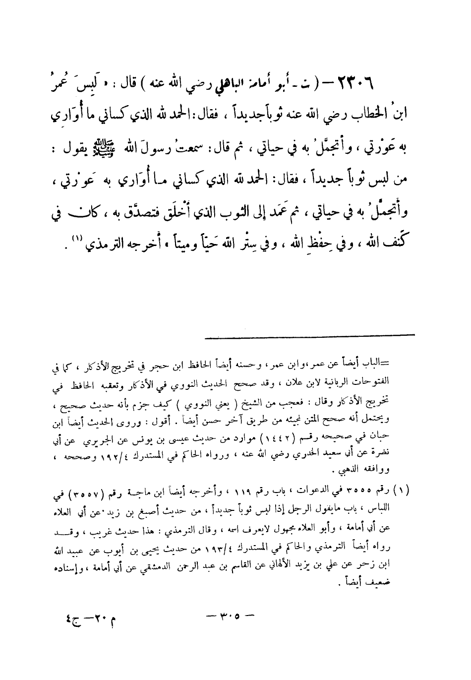 2306 - (ت) أبو أمامة الباهلي - رضي الله عنه -: قال: «لَبِسَ عُمرُ بنُ الخطاب - رضي الله عنه - ثوباً جديداً، فقال: الحمد لله الذي كساني ما أُوَارِي به عَوْرتي، وأتجمَّلُ به في حياتي، ثم قال: سمعتُ رسولَ الله -صلى الله عليه وسلم- يقول: من لبس ثوباً جديداً، فقال: الحمد لله الذي كساني ما أُوَاري به عَوْرتي، وأَتجمَّلُ به في حياتي، ثم عَمَد إلى الثوب الذي أَخْلَق فتصدَّق به، كان في كَنف الله، وفي حِفْظِ الله، وفي سِتْر الله حَيّاً وميتاً» أخرجه الترمذي (¬1) .
