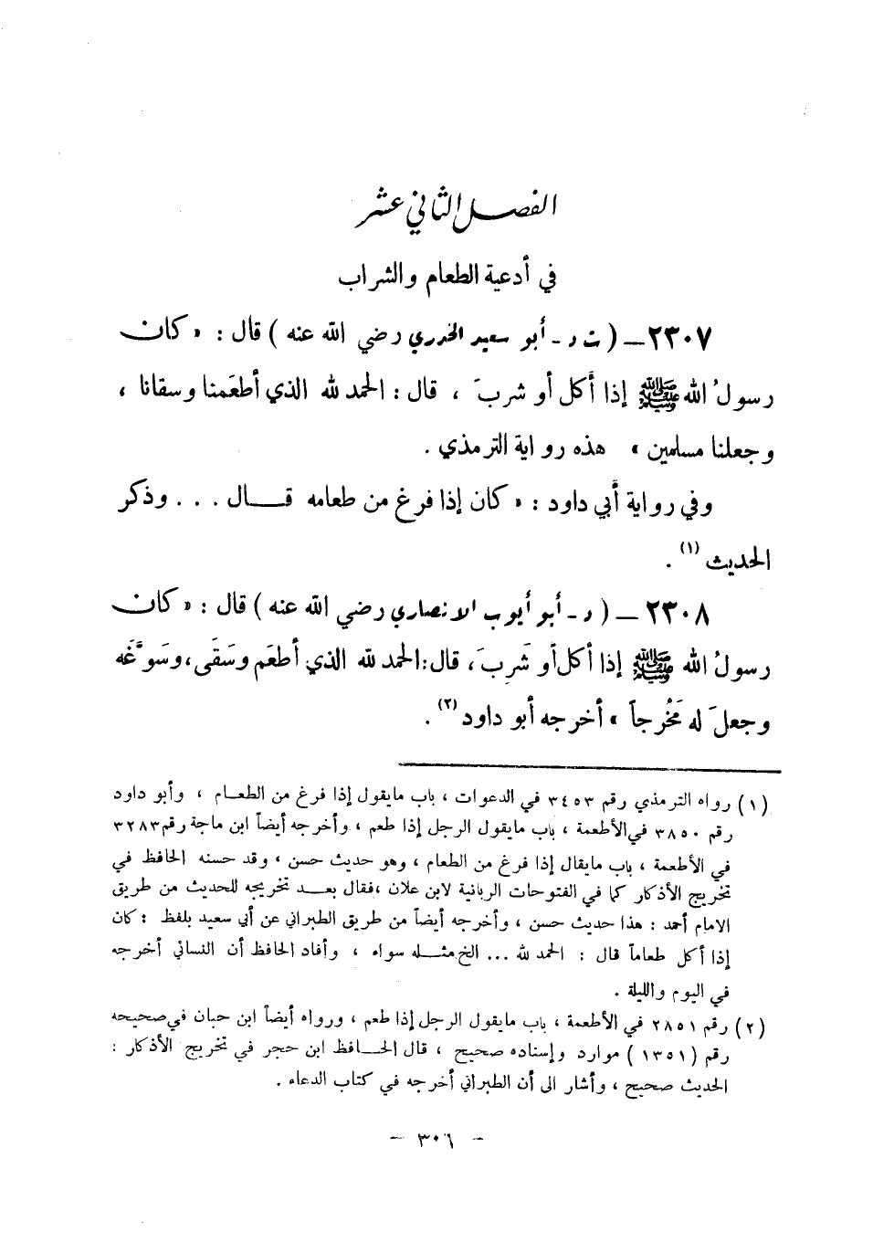 2307 - (ت د) أبو سعيد الخدري - رضي الله عنه -: قال: «كان رسولُ الله - صلى الله عليه وسلم- إذا أَكل أو شربَ، قال: الحمد لله الذي أطعَمنا وسقانا، وجعلنا مسلمين» . هذه رواية الترمذي.