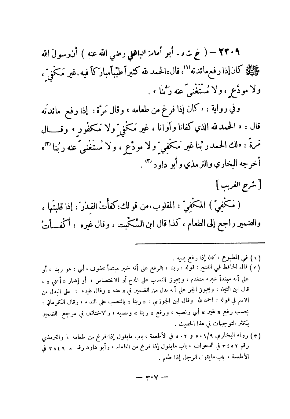 2309 - (خ ت د) أبو أمامة الباهلي - رضي الله عنه -: أن رسولَ الله -صلى الله عليه وسلم- كان إذا رفع مائدته (¬1) ، قال: «الحمد لله كثيراً طيِّباً مبارَكاً فيه، غير مَكْفيّ، ولا مودَّعٍ، ولا مُسْتَغْنى عنه رَبُّنا» .