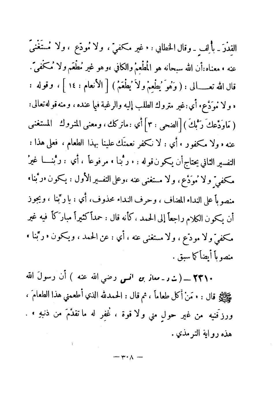 2310 - (ت د) معاذ بن أنس - رضي الله عنه -: أن رسولَ الله - صلى الله عليه وسلم- قال: «مَنْ أكل طعاماً، ثم قال: الحمد لله الذي أطعمني هذا الطعامَ، ورزَقنيه من غير حولٍ مني ولا قوة، غُفِر له ما تقدَّمَ من ذنبهِ» هذه رواية الترمذي. -[309]-