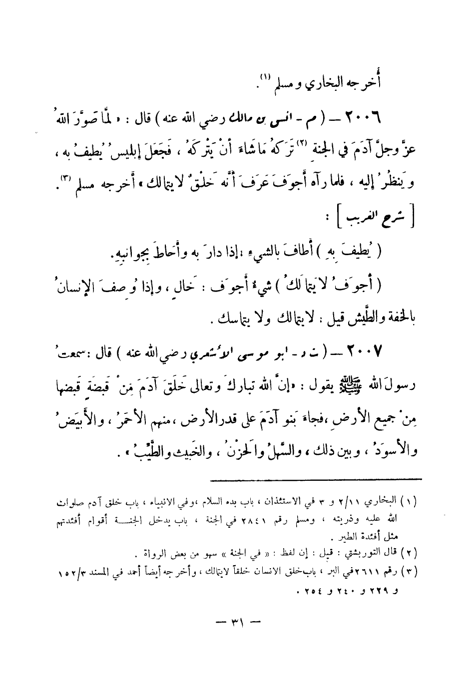 2006 - (م) أنس بن مالك - رضي الله عنه -: قال: «لمَّا صَوَّرَ اللهُ -عَزَّ وجلَّ - آدَمَ في الجنةِ (¬1) تَرَكهُ مَا شَاءَ أنْ يَتْرُكَهُ، فَجَعَلَ إِبليسُ يُطيفُ به، ويَنظُرُ إليه، فلما رآه أجوَف عَرَف أنَّهُ خَلْقٌ لا يتمالك» أخرجه مسلم (¬2) .