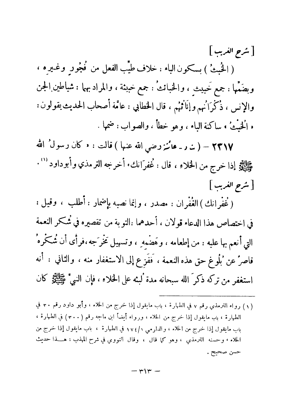 2317 - (ت د) عائشة - رضي الله عنها -: قالت: «كان رسولُ الله -صلى الله عليه وسلم- إذا خرج من الخلاءِ، قال: غُفرَانك» أخرجه الترمذي، وأبو داود (¬1) .