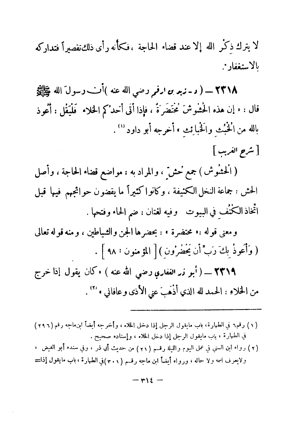 2318 - (د) زيد بن أرقم - رضي الله عنه -: أن رسولَ الله - صلى الله عليه وسلم- قال: «إن هذه الحُشُوشَ مُحْتَضَرَةٌ، فإذا أتَى أَحَدُكم الخلاء فَلْيَقُل: أَعُوذ بالله من الخُبُثِ والخبَائِثِ» أخرجه أبو داود (¬1) .