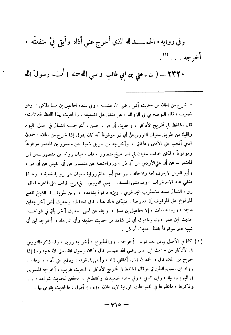 2320 - (ت) علي بن أبي طالب - رضي الله عنه -: أن رسولَ الله -[316]- صلى الله عليه وسلم- قال: «سِتْرُ ما بين أَعْيُنِ الجِنِّ وعَوْرَاتِ بني آدم - إذا دخل أَحدُهم الخلاءَ - أن يقول: بسم الله» . أخرجه الترمذي (¬1) .