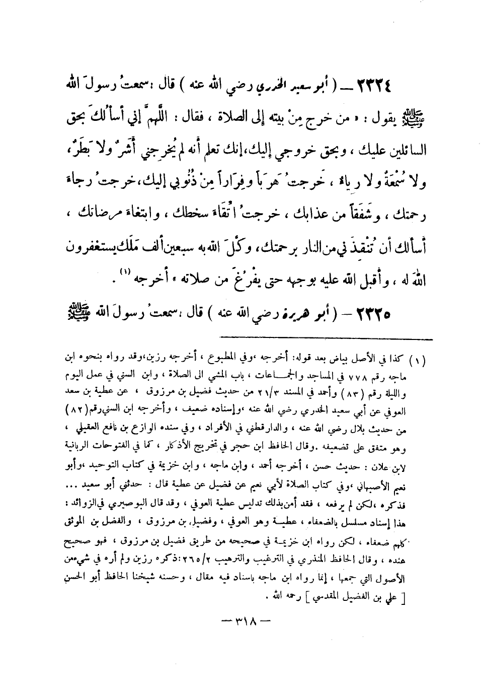 2324 - () أبو سعيد الخدري - رضي الله عنه -: قال: سمعتُ رسولَ الله - صلى الله عليه وسلم- يقول: «من خرج مِنْ بيته إلى الصلاة، فقال: اللَّهمَّ إني أسألُكَ بحق السائلين عليك، وبحق خروجي إليك، إنك تعلم أَنه لم يُخرِجني أَشَرٌ ولا بَطَرٌ، ولا سُمْعَةٌ، ولا رِياءٌ، خَرجتُ هَرَباً وفِرَاراً مِنْ ذُنُوبي إليك، خرجتُ رجاءَ رحمتك، وشَفَقاً من عذابك، خرجتُ اتِّقَاءَ سخطك، وابتغاءَ مرضاتك، أَسألك أن تُنْقِذَني من النار برحمتك، وكَّلَ الله به سبعين ألف مَلَك يستغفرون اللهَ له، وأقبل الله عليه بوجهه حتى يفْرُغَ من صلاته» أخرجه (¬1) .