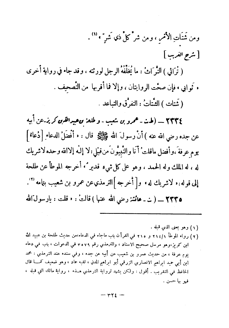 2334 - (ط ت) عمرو بن شعيب، وطلحة بن عبيد الله بن كريز - عن أبيه عن جده - رضي الله عنه: أَنَّ رسولَ اللهِ -صلى الله عليه وسلم- قال: «أَفْضَلُ الدعاء [دُعاء] يومِ عرفةَ، وأفضل ما قلتُ أنَا والنَّبِيُّونَ من قَبْلي: لا إِله إِلا الله وحده لا شريك له، لَهُ الملكُ وله الحمدُ، وهو على كل شيء قديرٌ» . أخرجه الموطأ عن طلحة إلى قوله: «لا شريك له» ، و [أخرجه] الترمذي عن عمرو بن شعيب بتمامه (¬1) .