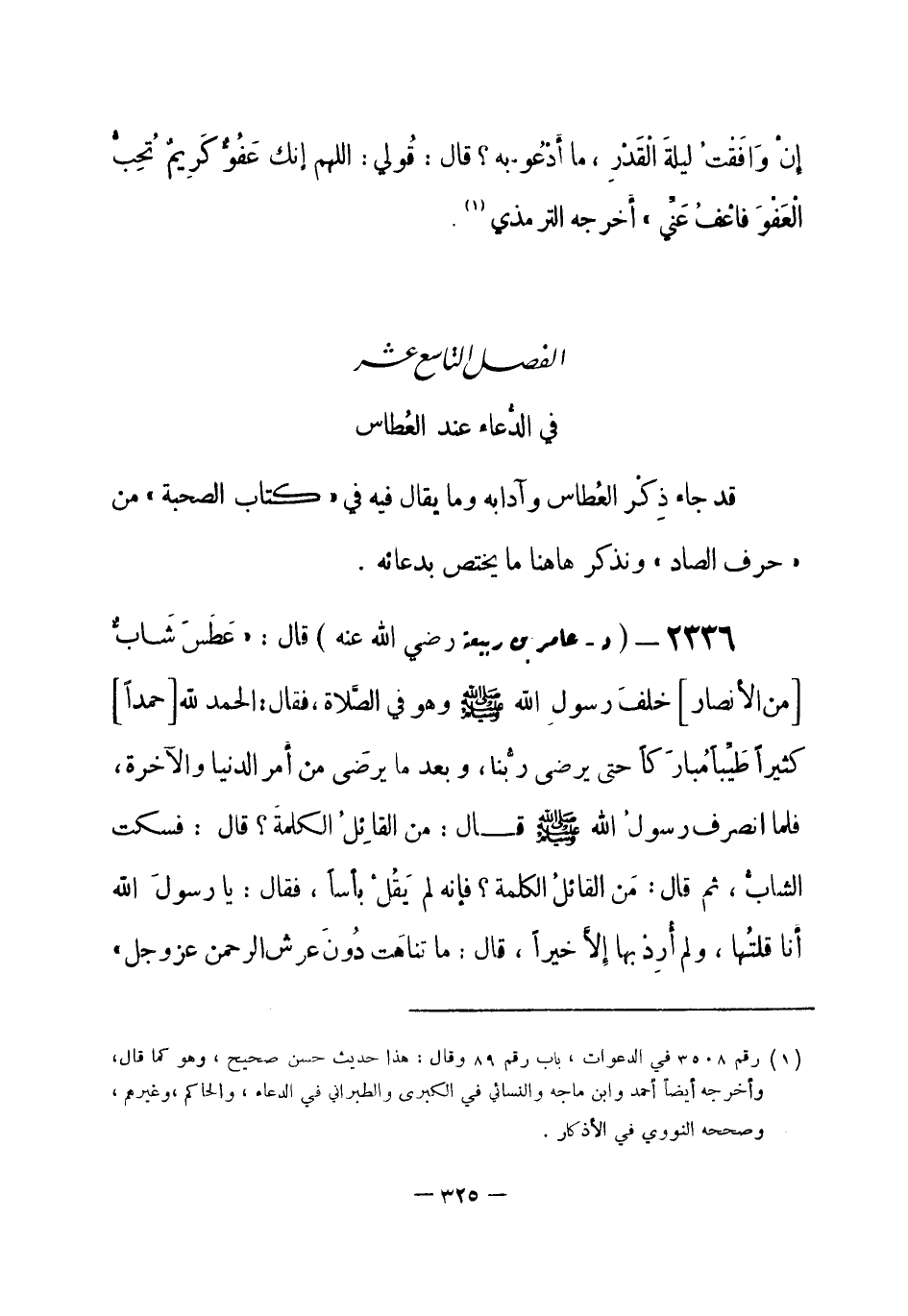 2336 - (د) عامر بن ربيعة - رضي الله عنه -: قال: «عَطَسَ شَابٌ [من الأنصار] خلفَ رسولِ الله - صلى الله عليه وسلم- وهو في الصَّلاة، فقال: الحمد لله [حمداً] كثيراً طَيِّباً مُبارَكاً حتى يرضى ربُّنا، وبعد ما يرضَى من أَمر الدنيا والآخرة، فلما انصرف رسولُ الله - صلى الله عليه وسلم- قال: من القائِلُ الكلمةَ؟ قال: فسكت الشابُّ، ثم قال: مَن القائلُ الكلمة؟ فإنه لم يَقُلْ بأساً، فقال: يا رسولَ الله أنا قُلتُها، ولم أُرِدْ بها إلا خيراً، قال: ما تناهَت دُونَ عرش الرحمن - عز وجل -» . -[326]- أخرجه أبو داود (¬1) .