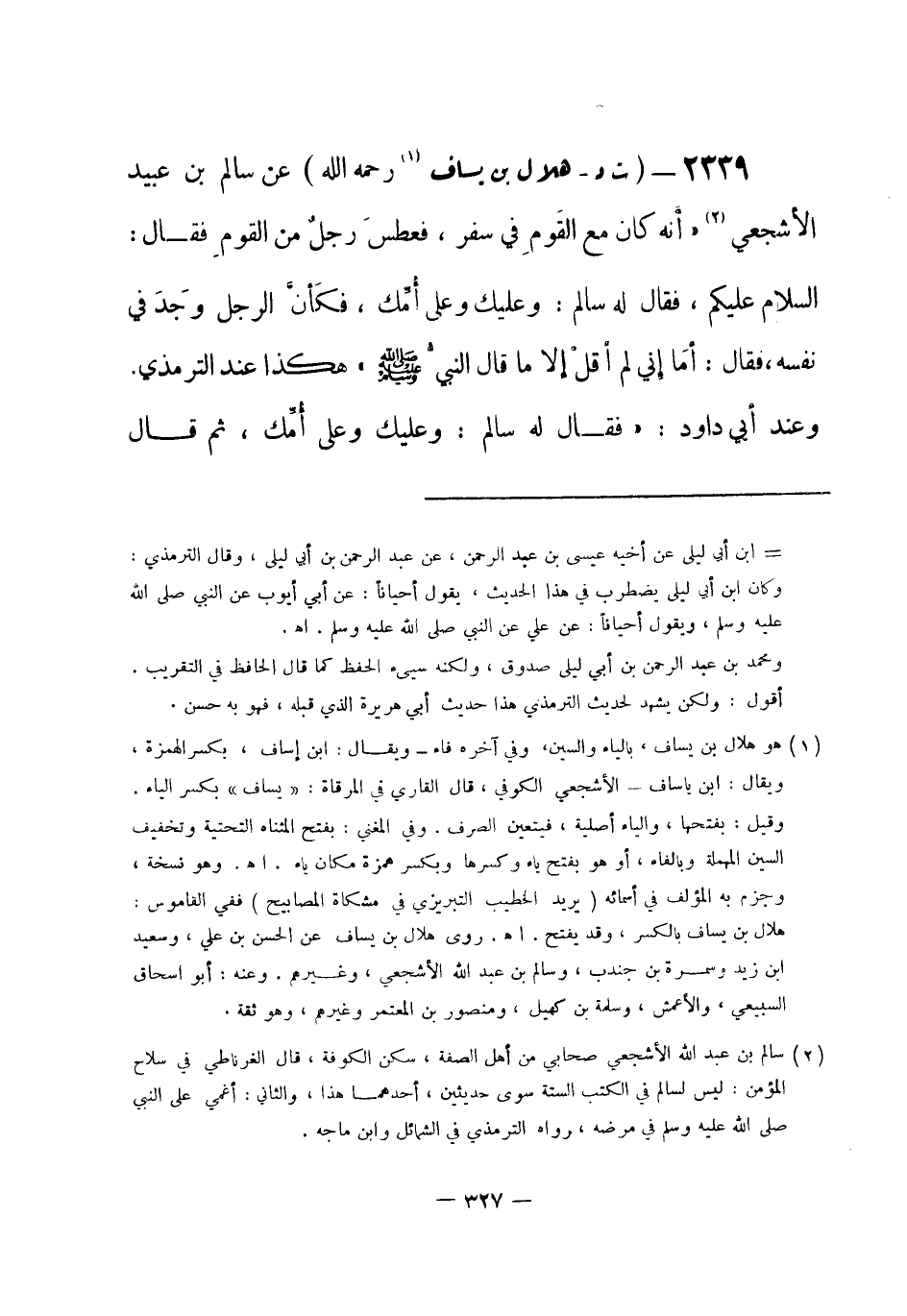2339 - (ت د) هلال بن يساف (¬1) - رحمه الله -: عن سالم بن عبيد الأشجعي (¬2) «أَنه كان مع القَومِ في سفر، فعطسَ رجلٌ من القومِ، فقال: السلام عليكم، فقال له سالم: وعليك، وعلى أُمِّك، فكَأنَّ الرجل، وَجدَ في نفسه، فقال: أمَا إني لم أَقُلْ إلا ما قال النبيُّ - صلى الله عليه وسلم-» هكذا عند الترمذي.