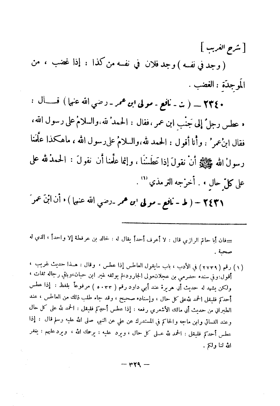2340 - (ت) نافع مولى ابن عمر - رضي الله عنهما -: قال: «عطس رجلٌ إلى جَنْبِ ابن عمر، فقال: الحمدُ لله، والسلامُ على رسول الله، فقال ابنُ عمرُ: وأَنا أَقول: الحمد لله، والسلامُ على رسول الله، ما هكذا علَّمَنا رسولُ الله - صلى الله عليه وسلم- أَنْ نقولَ إذا عَطَسْنَا، وإنما علَّمنا أن نقولَ: الحمدُ لله على كلِّ حالٍ» . أخرجه الترمذي (¬1) .