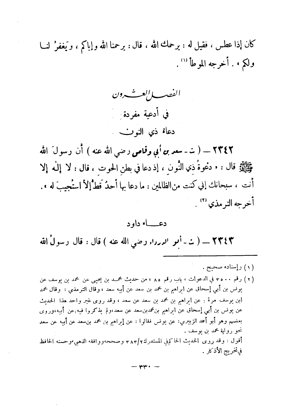 2342 - (ت) سعد بن أبي وقاص - رضي الله عنه -: أَنَّ رسولَ الله -صلى الله عليه وسلم- قال: «دعْوةُ ذِي النُّونِ، إذ دعا في بطنِ الحوتِ، قال: لا إِله إلا أنت، سبحانك إني كنت من الظالمين: ما دعا بها أَحَدٌ قَطُّ إِلا استُجيبَ له» . أخرجه الترمذي (¬1) .