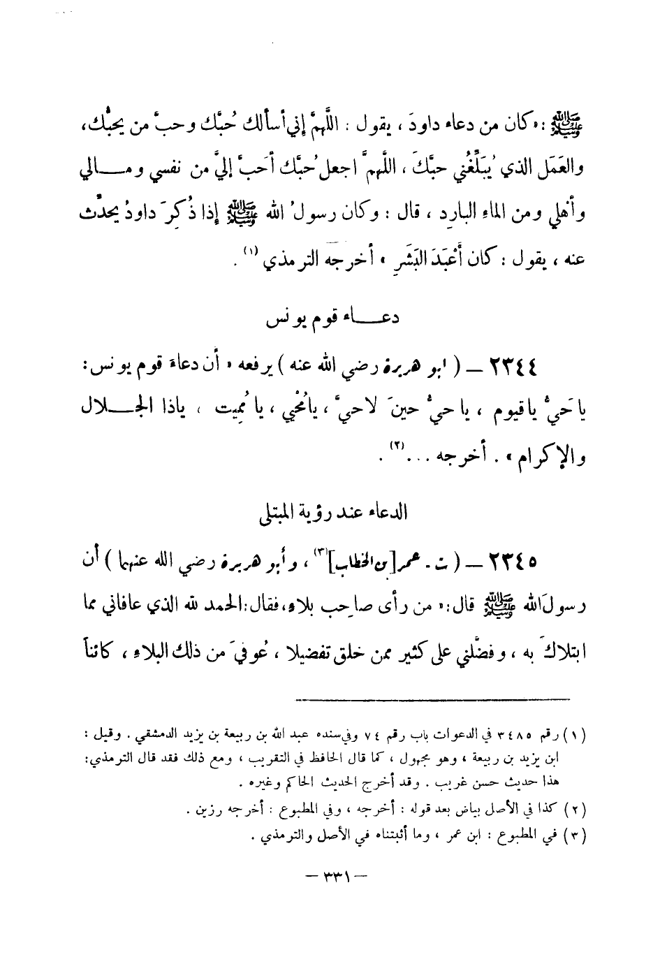 2344 - () أبو هريرة - رضي الله عنه -: يرفعه: «أَن دعاءَ قوم يونس: يا حَيُّ يا قيوم، يا حيُّ حينَ لا حيَّ، يا مُحْيي، يا مُمِيت، يا ذا الجلال والإكرام» . أخرجه ... (¬1) .