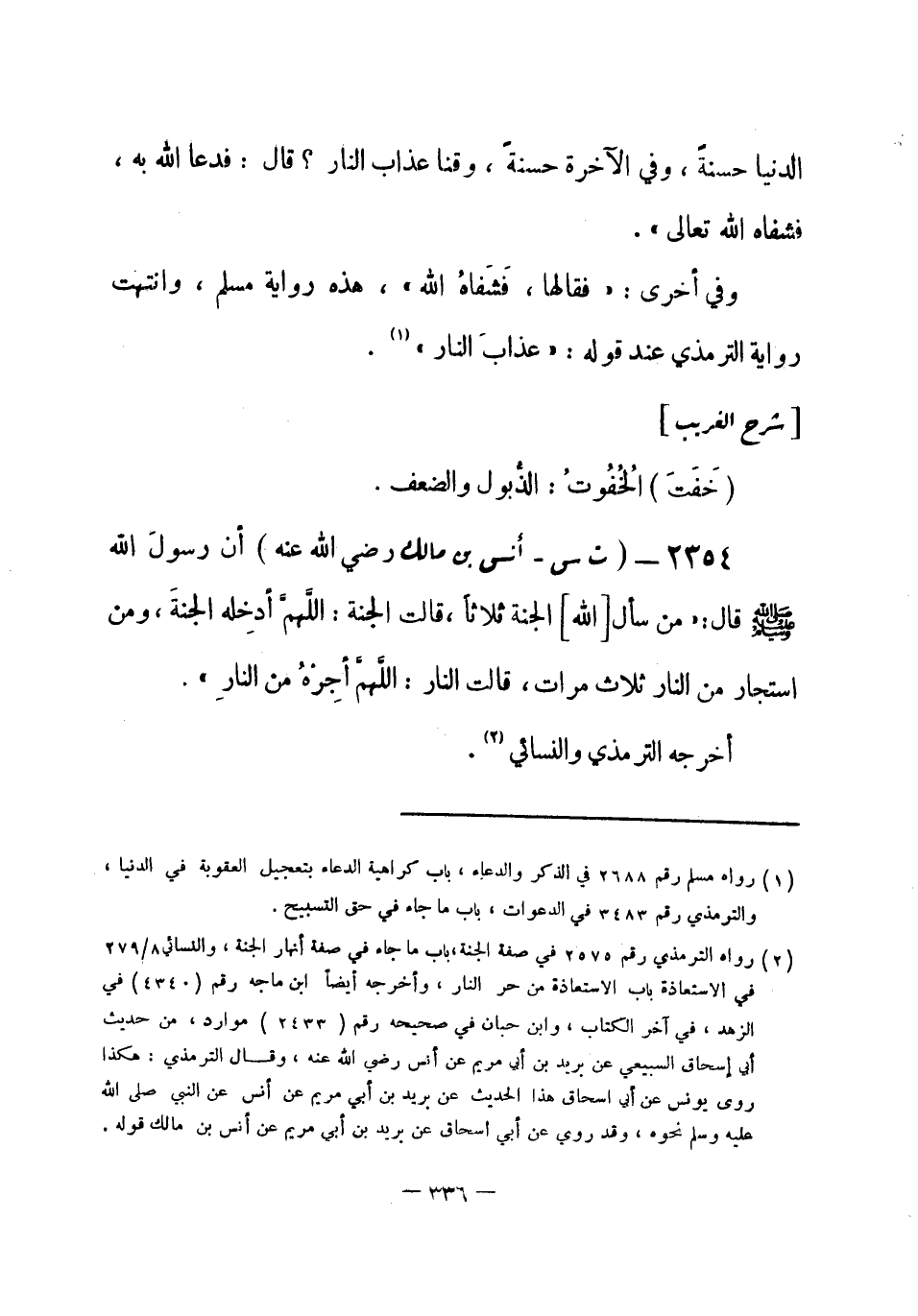 2354 - (ت س) أنس بن مالك - رضي الله عنه -: أَنَّ رسولَ اللهِ - صلى الله عليه وسلم- قال: «من سأل [الله] الجنة ثلاثاً، قالت الجنة:اللَّهمَّ أدخِله الجنةَ، ومن استجار من النار ثلاث مرات، قالت النار: اللَّهمَّ أجِرْهُ من النارِ» . أخرجه الترمذي، والنسائي (¬1) .