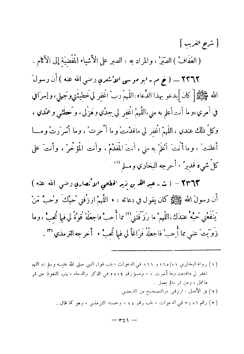 2362 - (خ م) أبو موسى الأشعري - رضي الله عنه -: أن رسولَ الله - صلى الله عليه وسلم-[كان] يدعو بهذا الدُّعَاءِ: «اللَّهمَّ ربِّ اغْفِر لي خَطِيئَتي وجَهلي، وإسرَافي في أمري، وما أَنت أَعلم به مني، اللَّهمَّ اغْفِر لي جِدِّي وهَزْلي، وخَطَئي وعَمْدي، وكلُّ ذلك عندي، اللَّهمَّ اغْفِر لي ما قَدَّمتُ وما أخَّرتُ، وما أسْرَرتُ وما أَعلنتُ، وما أنْتَ أعْلَمُ به مني، أنتَ الْمُقَدِّمُ، وأنت المُؤخِّرُ، وَأَنتَ على كلِّ شيءٍ قَدِيرٌ» أخرجه البخاري، ومسلم (¬1) .