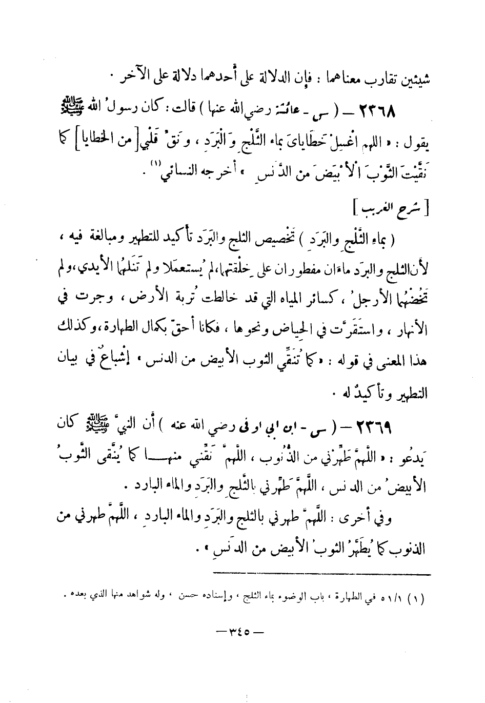 2369 - (س) ابن أبي أوفى - رضي الله عنه -: أَن النبيَّ - صلى الله عليه وسلم- كان يَدْعُو: «اللَّهمَّ طَهِّرْني من الذُّنُوب، اللَّهمَّ نَقِّني منها كما يُنَقى الثَّوبُ الأبيضُ من الدَنس، اللَّهمَّ طَهِّرني بالثَّلجِ والبَرَدِ والماء البارد.