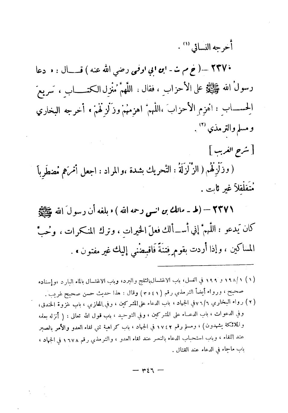 2370 - (خ م ت) ابن أبي أوفى - رضي الله عنه -: قال: «دعا رسولُ الله - صلى الله عليه وسلم- على الأحزابِ، فقال: اللَّهمَّ مُنْزِلَ الكتابِ، سَرِيعَ الحِسَابِ: اهْزِمِ الأحزابَ، اللَّهمَّ اهزِمهُمْ وزَلْزِلْهُمْ» . أخرجه البخاري، ومسلم، والترمذي (¬1) .