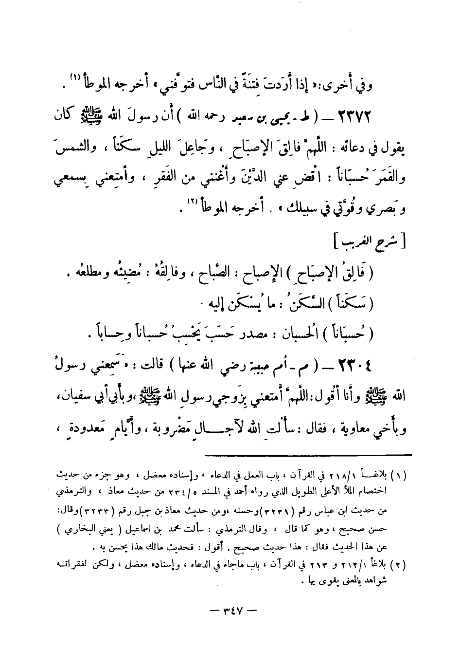 2372 - (ط) يحيى بن سعيد - رحمه الله -: أَن رسولَ الله - صلى الله عليه وسلم- كان يقول في دعائه: «اللَّهمَّ فالِقَ الإصبَاحِ، وجَاعِلَ الليلِ سكَناً، والشمسَ والقَمَرَ حُسبَاناً: اقْضِ عني الدَّيْنَ، وأَغْنني من الفَقرِ، وأمتِعني بِسمعي، وبَصري، وقُوَّتي في سبيلك» . أخرجه الموطأ (¬1) .