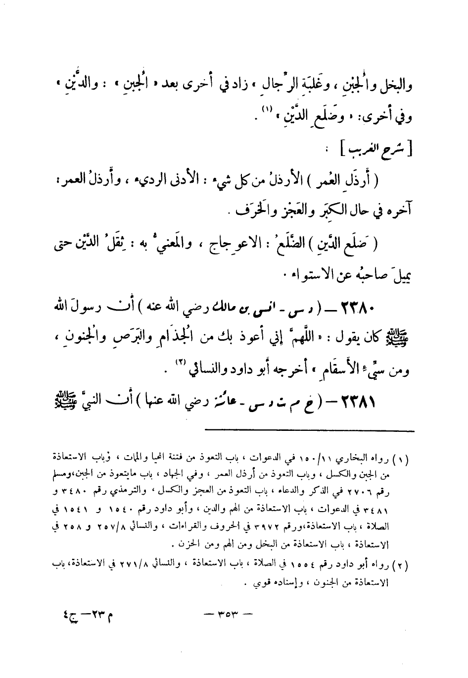 2380 - (د س) أنس بن مالك - رضي الله عنه -: أَنَّ رسولَ الله - صلى الله عليه وسلم- كان يقول: «اللَّهمَّ إِني أعوذ بك من الجُذَامِ، والبَرَصِ، والجُنونِ، ومن سيئ الأَسقَامِ» . أخرجه أبو داود، والنسائي (¬1) .